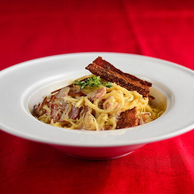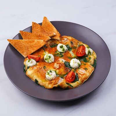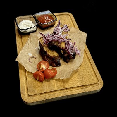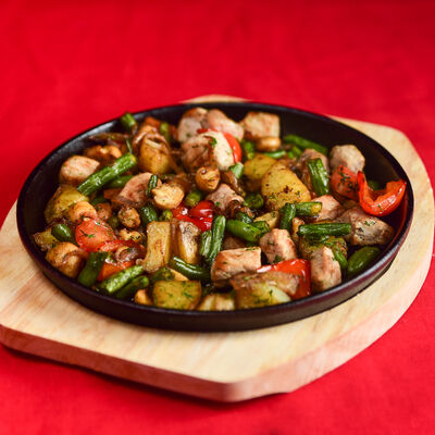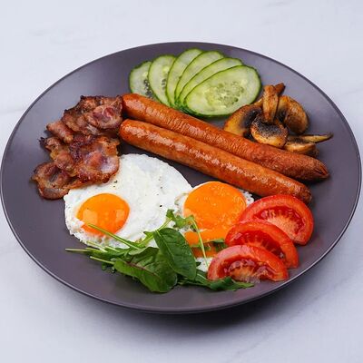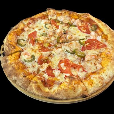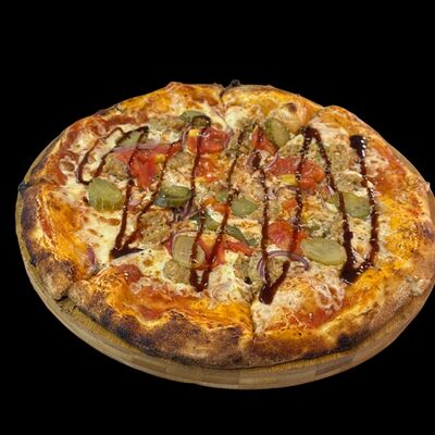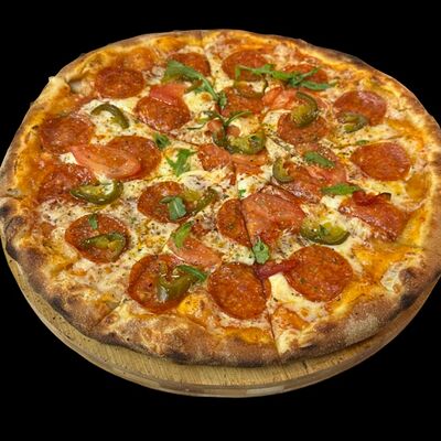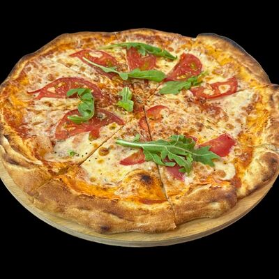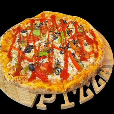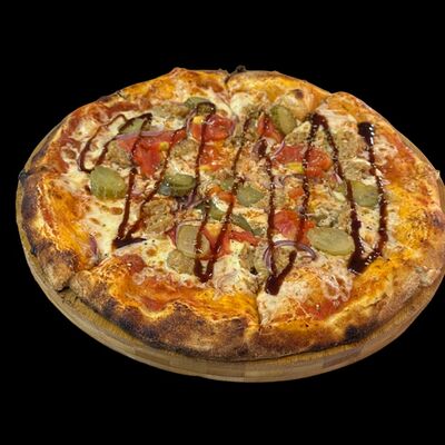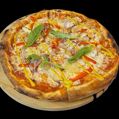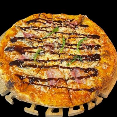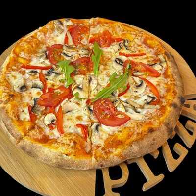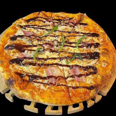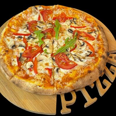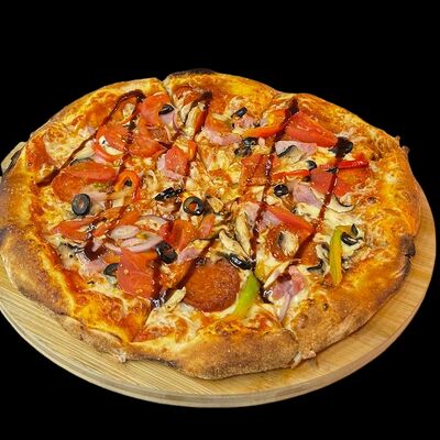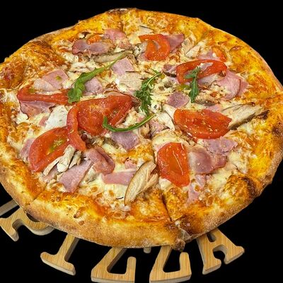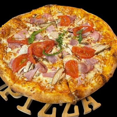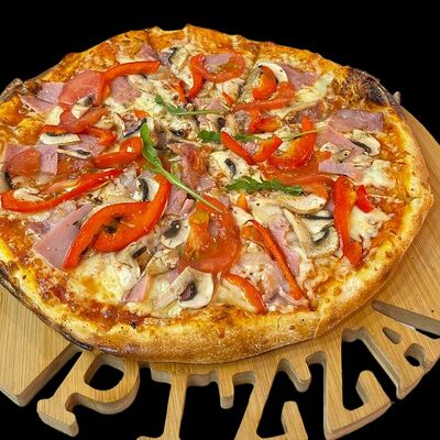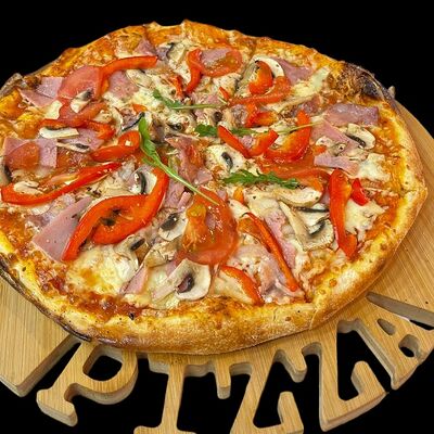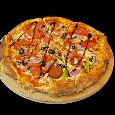 Бекон, ветчина, грибы шампиньоны, болгарский перец, спелые томаты, итальянская моцарелла, фирменный томатный соус (33 см)