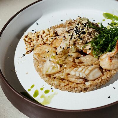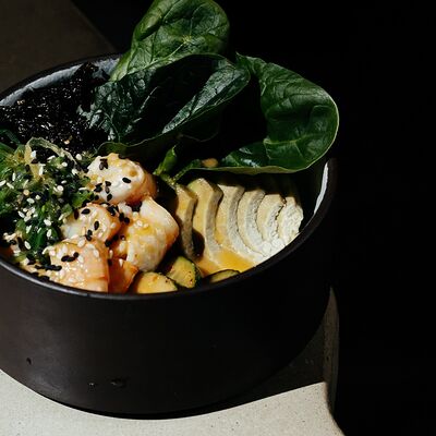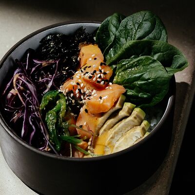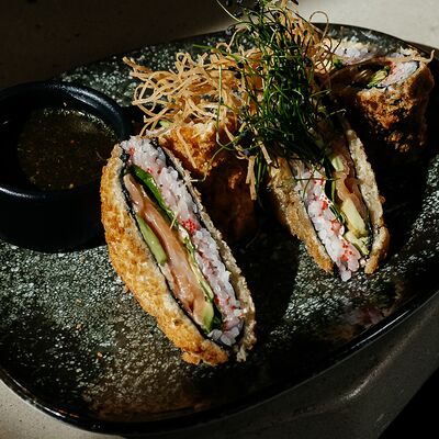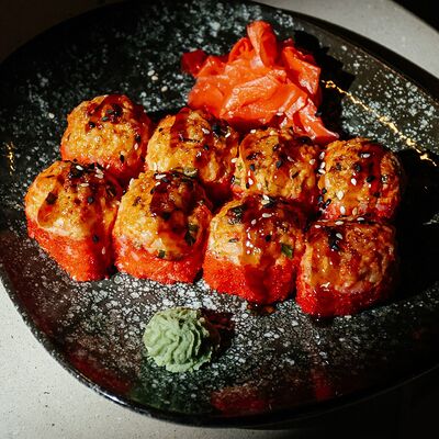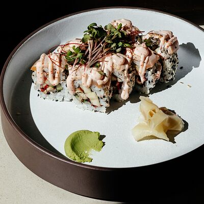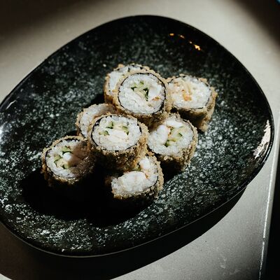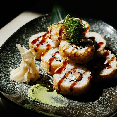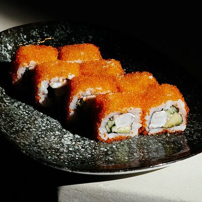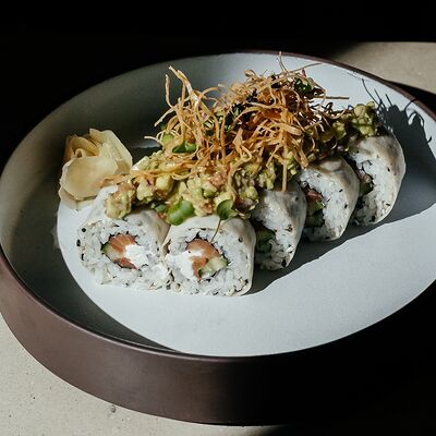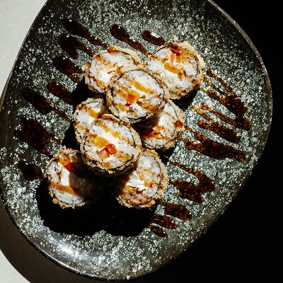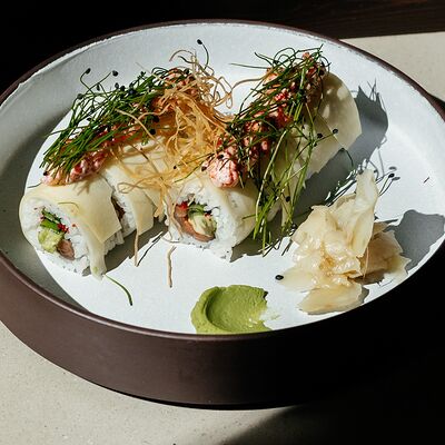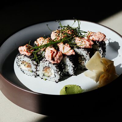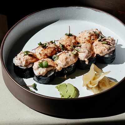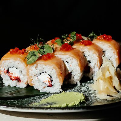 Рис, угорь, лосось, огурец, сливочный сыр, масаго черная, кинза, соус унаги, соус спайси, кунжут, имбирь, васаби