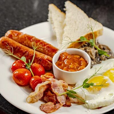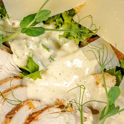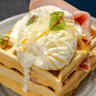 Хлеб белый, сливки, соль, масло подсолнечное, яйцо куриное, ветчина, сыр российский, горчица французская, микрозелень