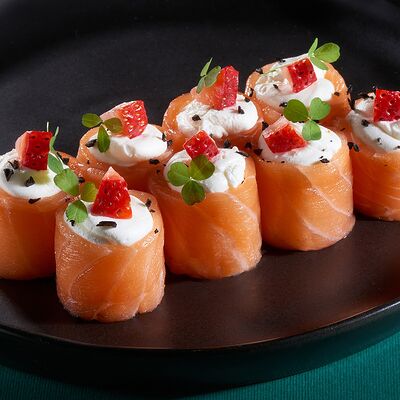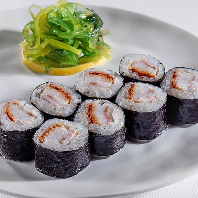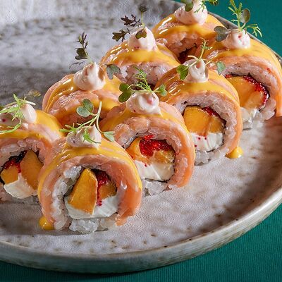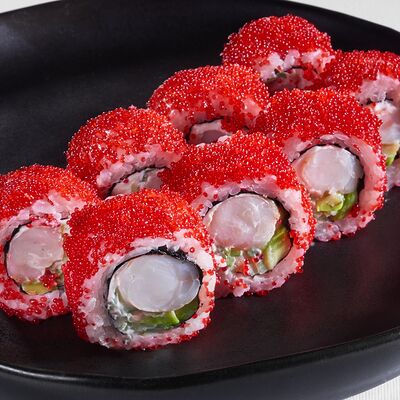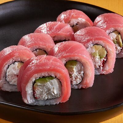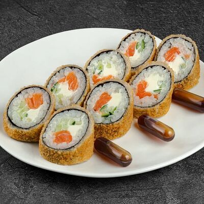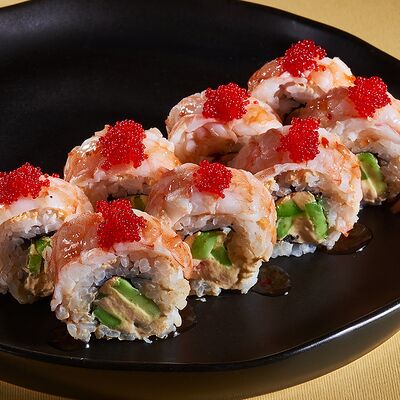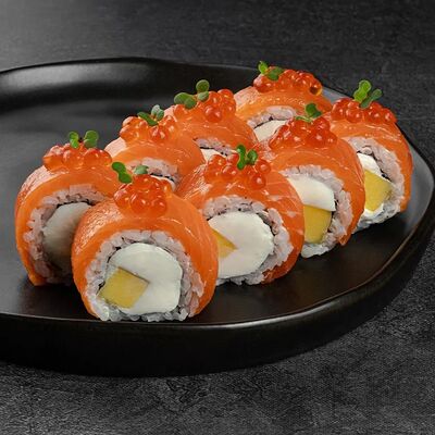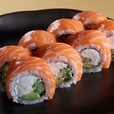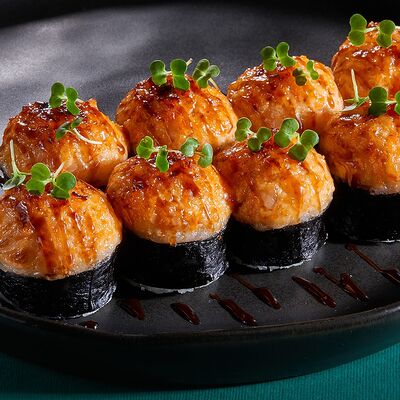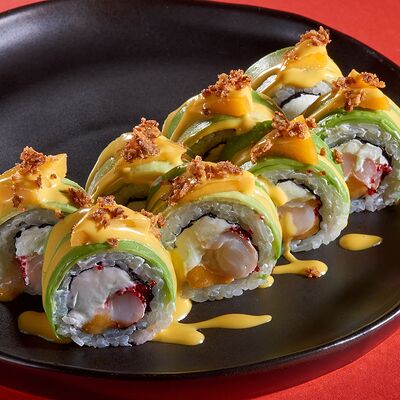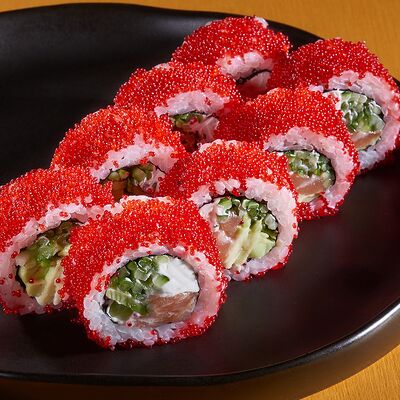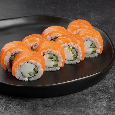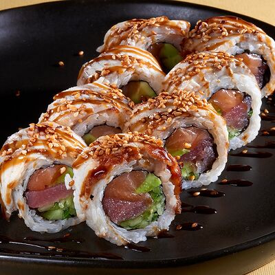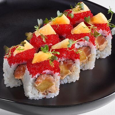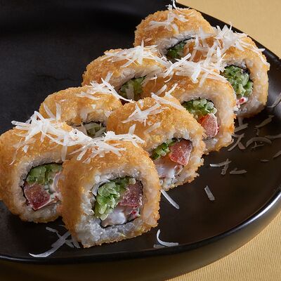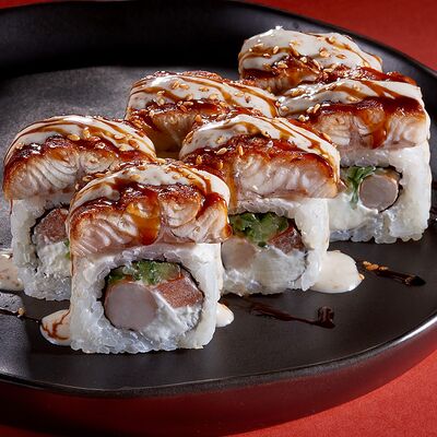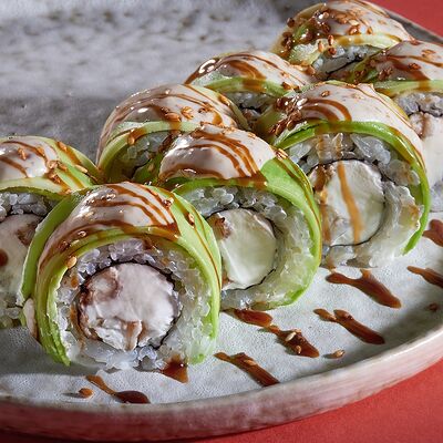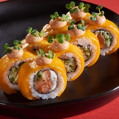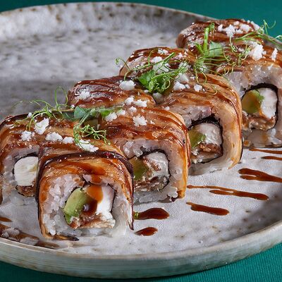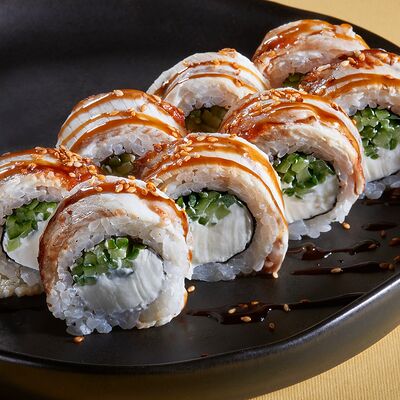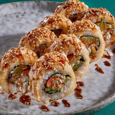 Запечённый ролл с угрем, сливочным сыром, авокадо, свежим томатом и огурцом