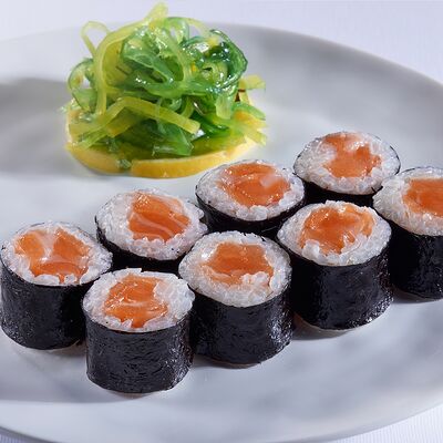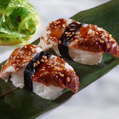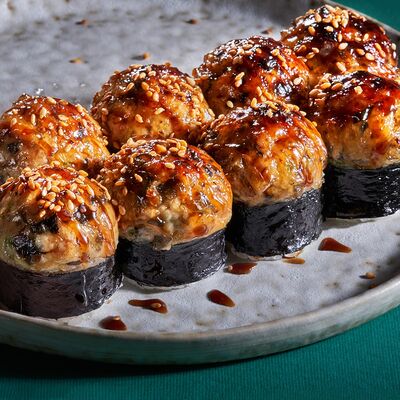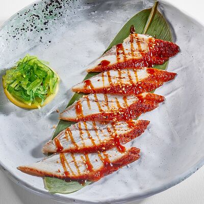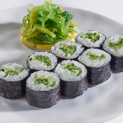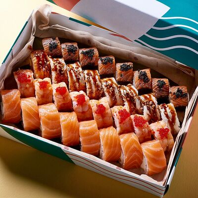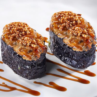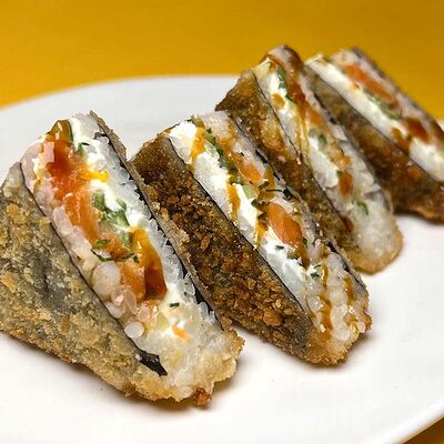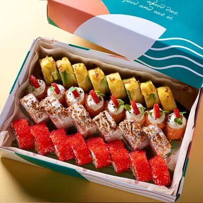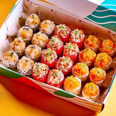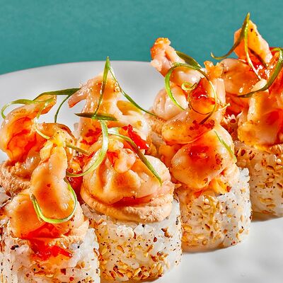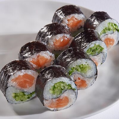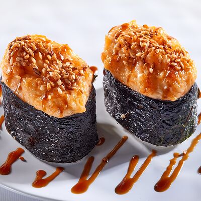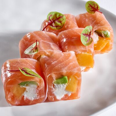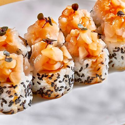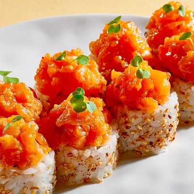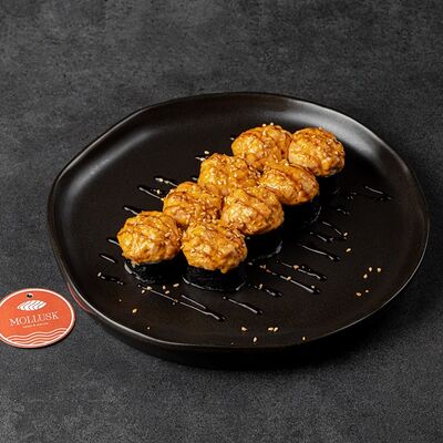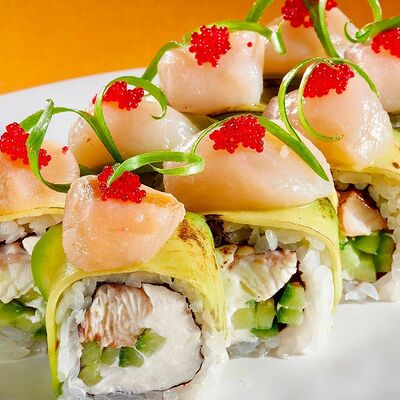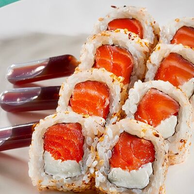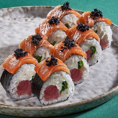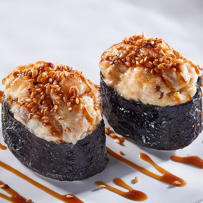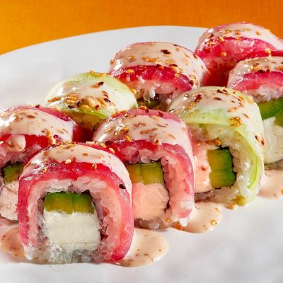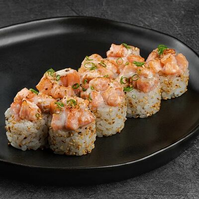 Запечённый ролл с угрем, сливочным сыром, авокадо, свежим томатом и огурцом