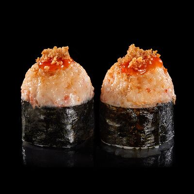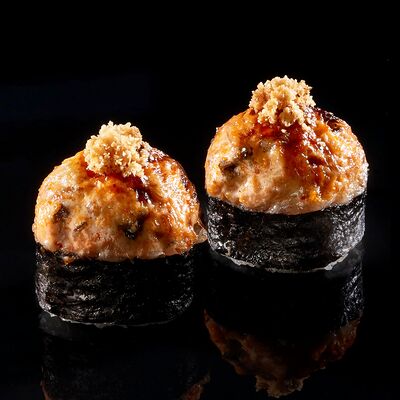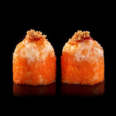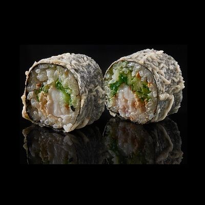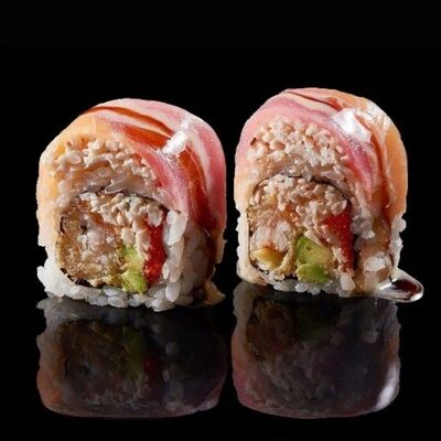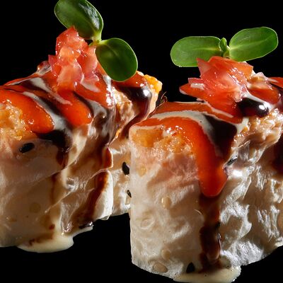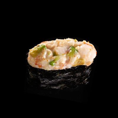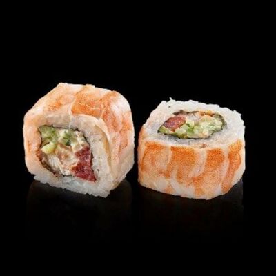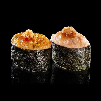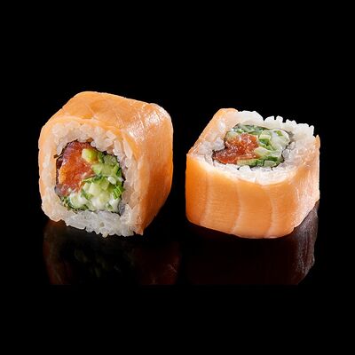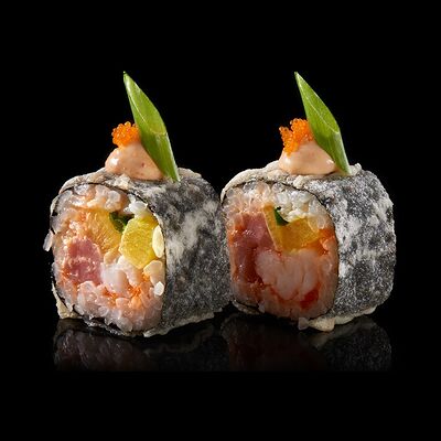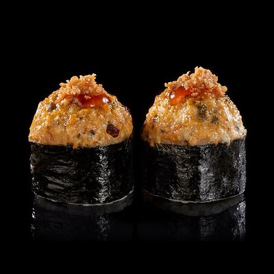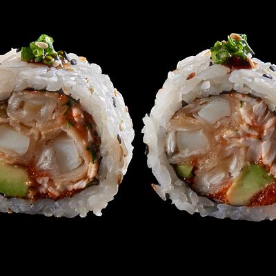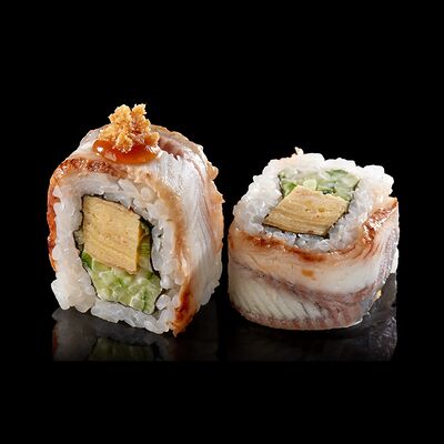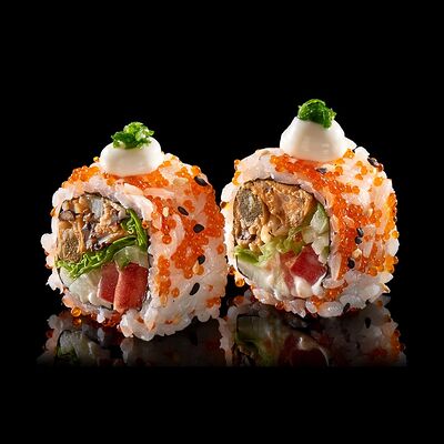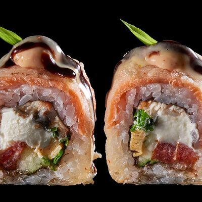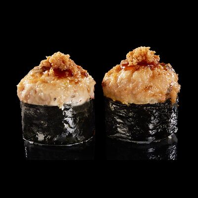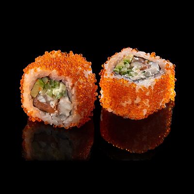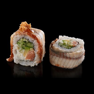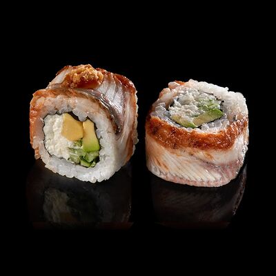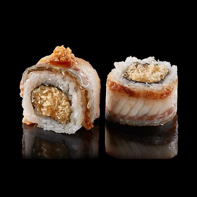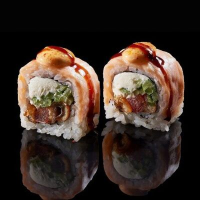 Угорь, креветка тигровая, лук зеленый, сыр творожный, соус Спайси, Унаги (5 шт.)