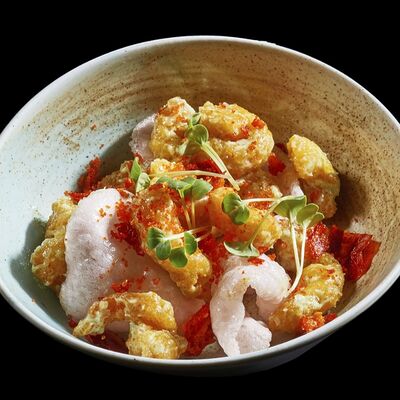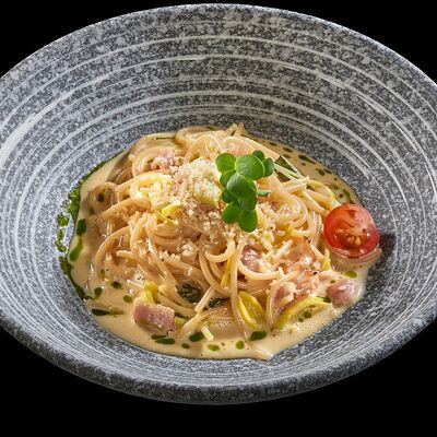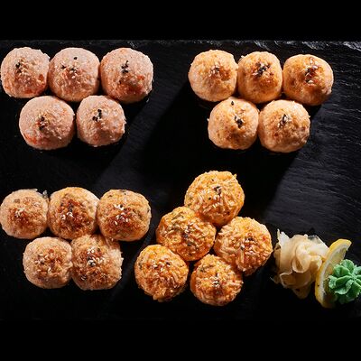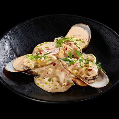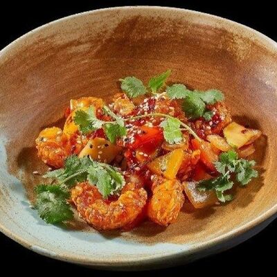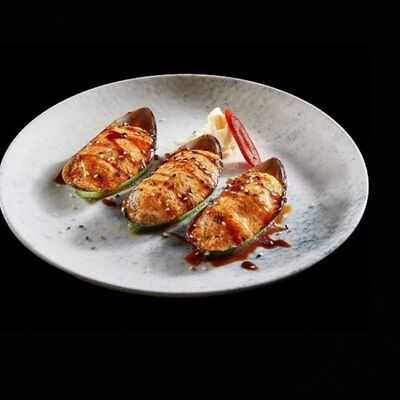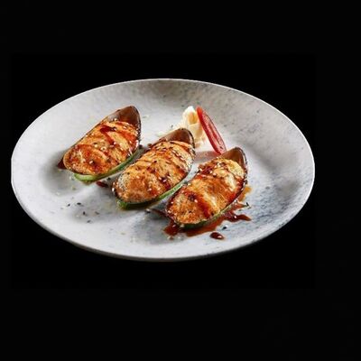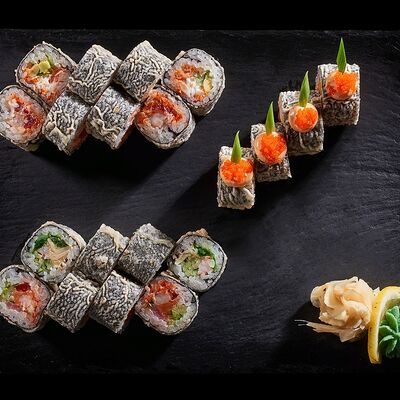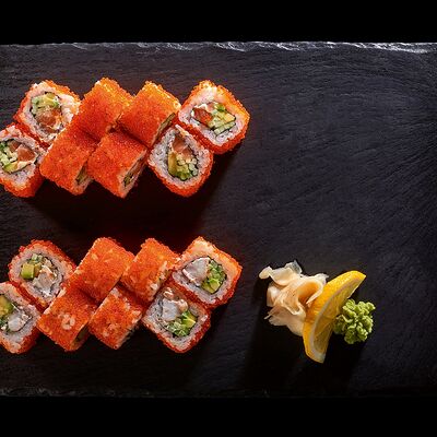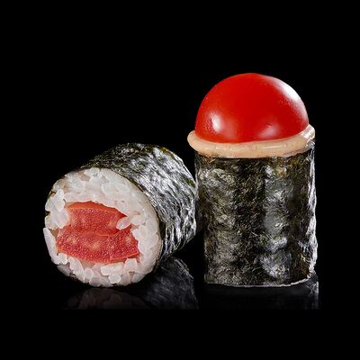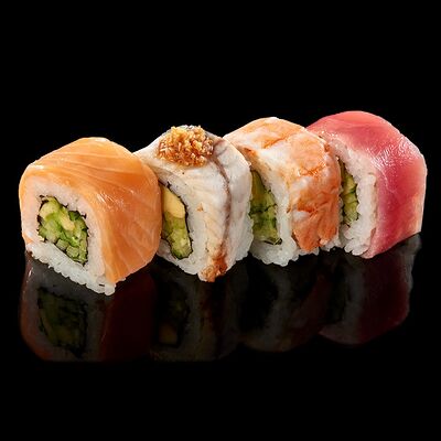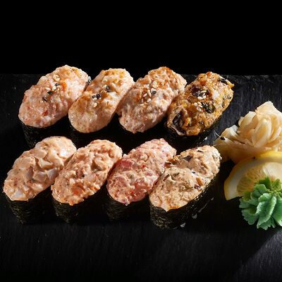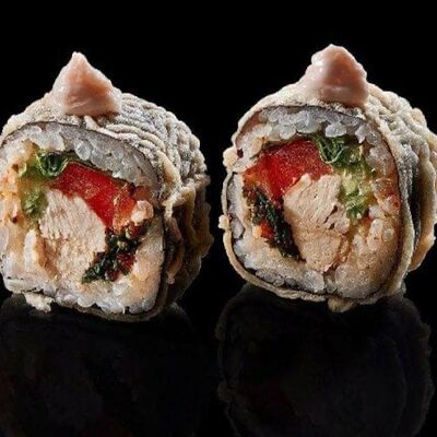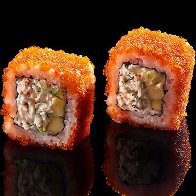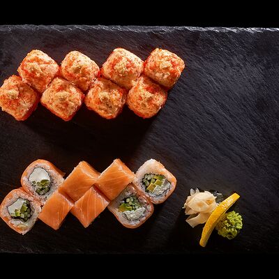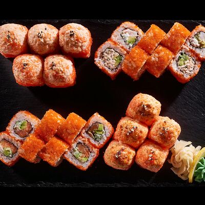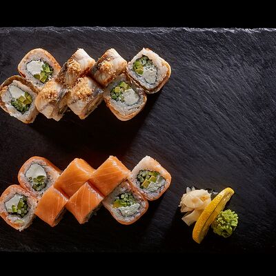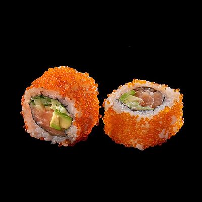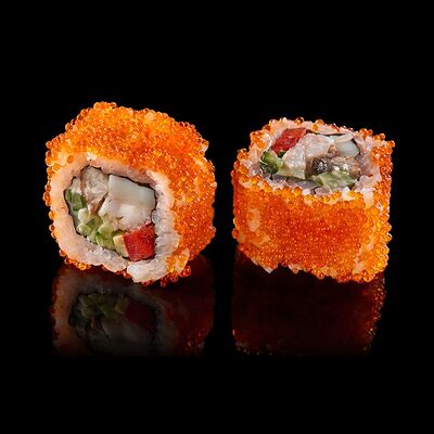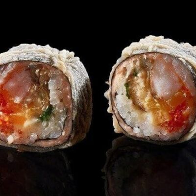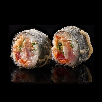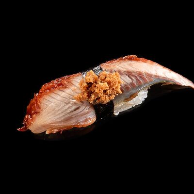 Угорь, креветка тигровая, лук зеленый, сыр творожный, соус Спайси, Унаги (5 шт.)