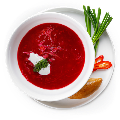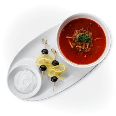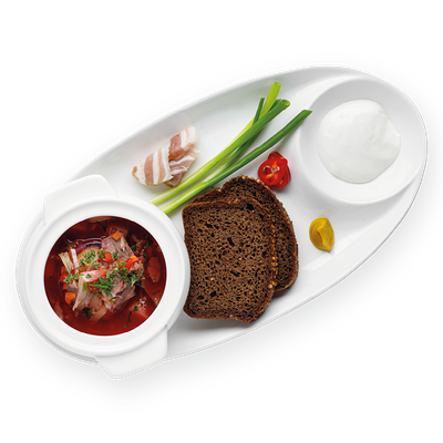 Куриный бульон, говядина, свекла, картофель, капуста, морковь, зеленый лук, томаты, сало, горчица, болгарский перец, сметана, укроп, перец чили