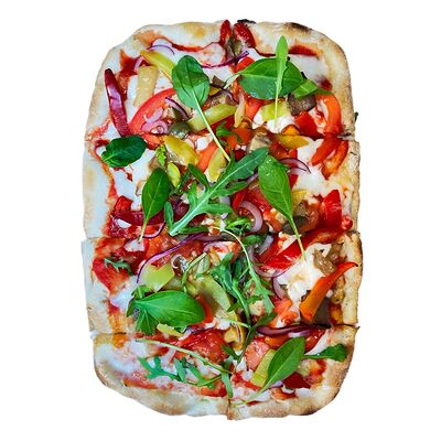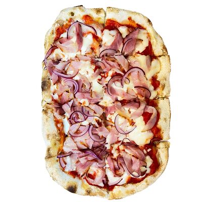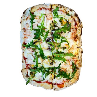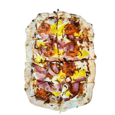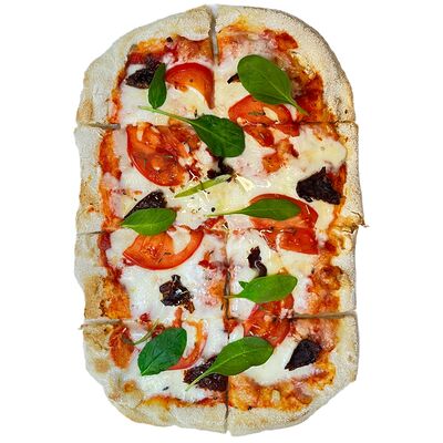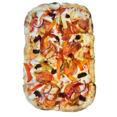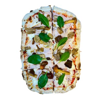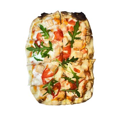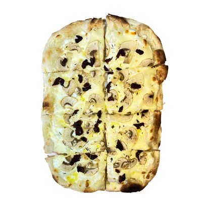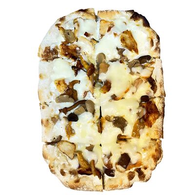 Фирменный сливочный соус, моцарелла, курочка, грибное ассорти, пармезан, черный перец, оливковое масло (30 см)