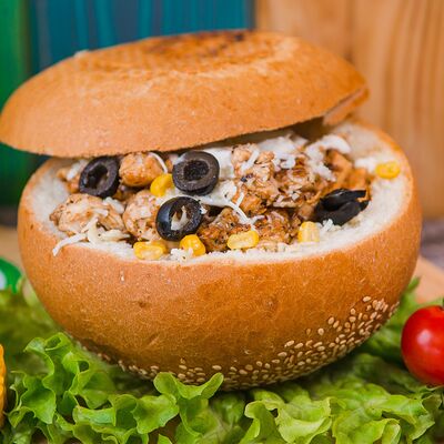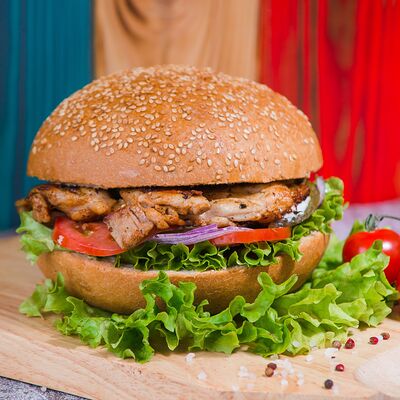 Куриное филе, салат айсберг, сыр чеддер, лук, помидор, бургер соус