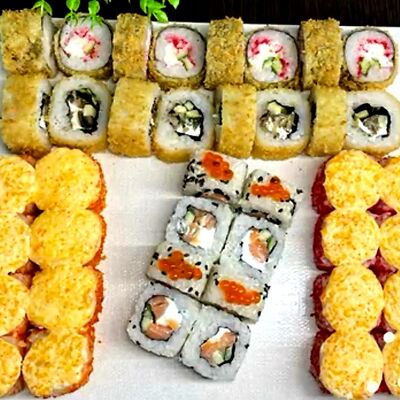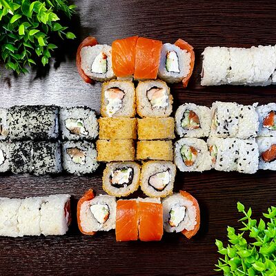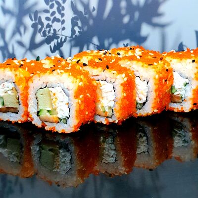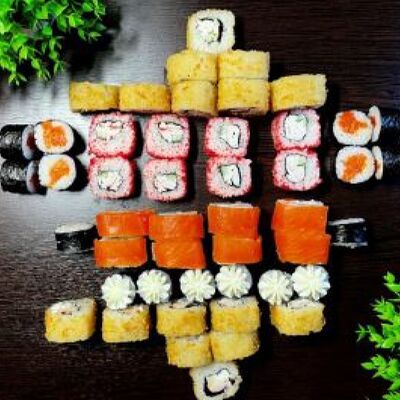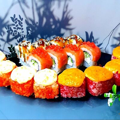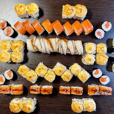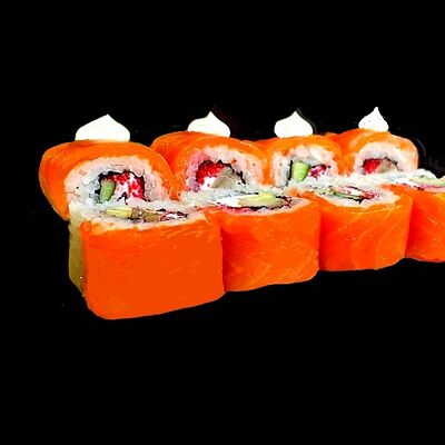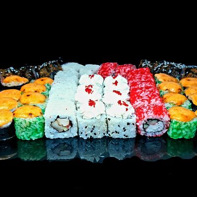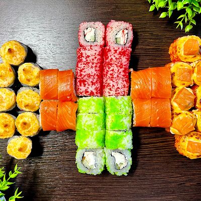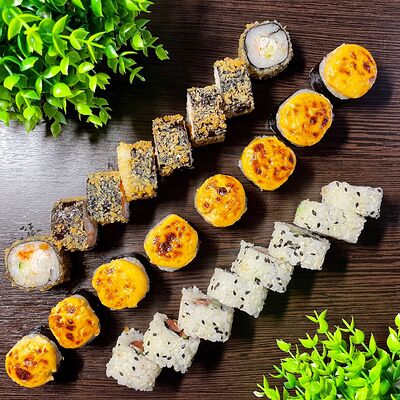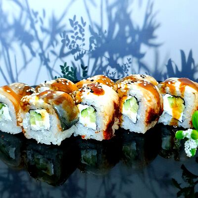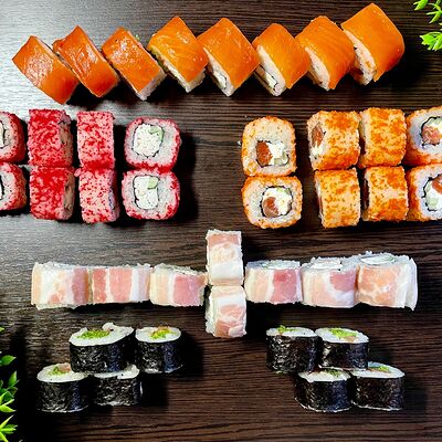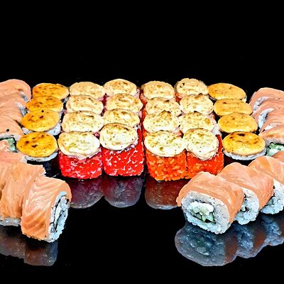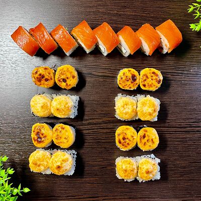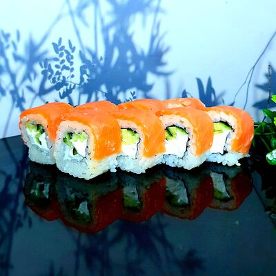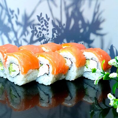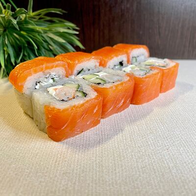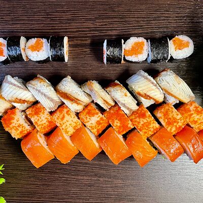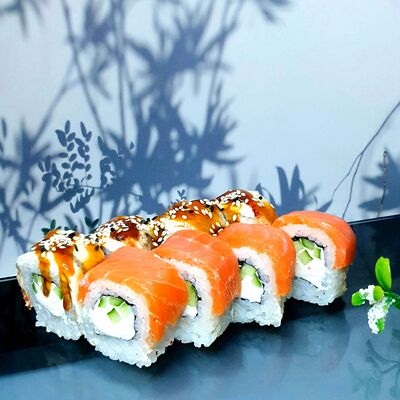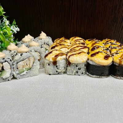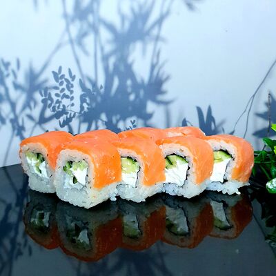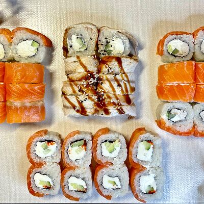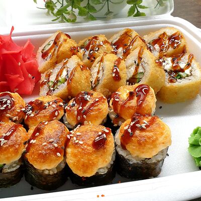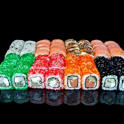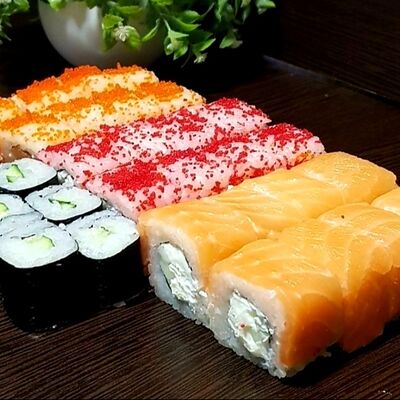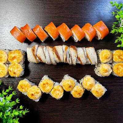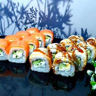 Филадельфия с угрем (угорь, нори, рис, сливочный сыр, огурец), Филадельфия с лососем (лосось, рис, нори, сливочный сыр, огурец), Аляска (лосось, угорь, рис), мини-ролл с лососем