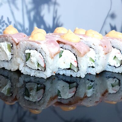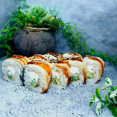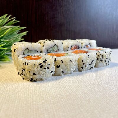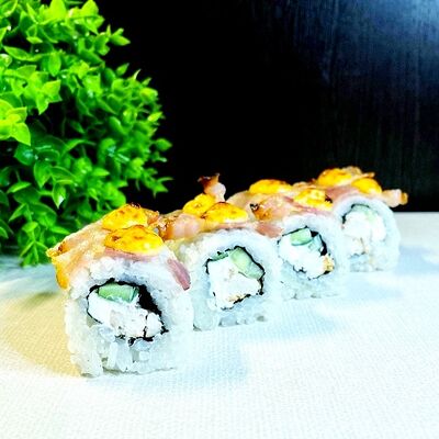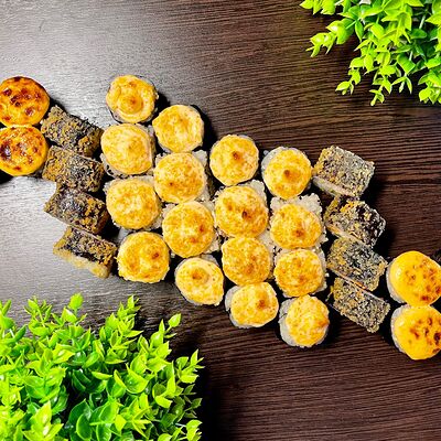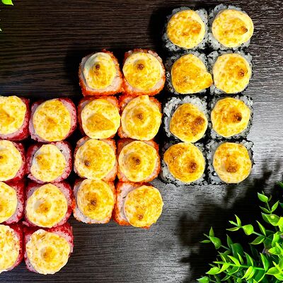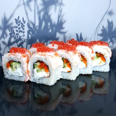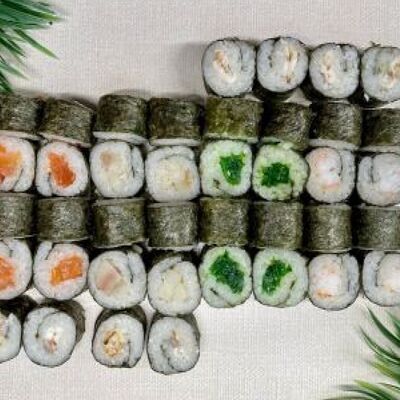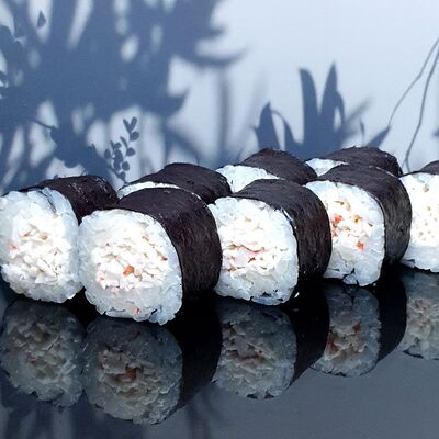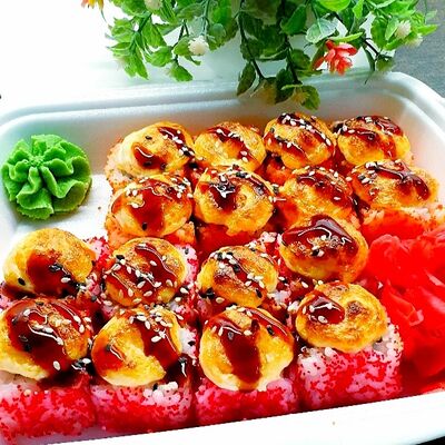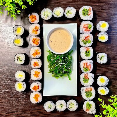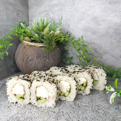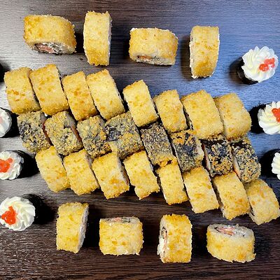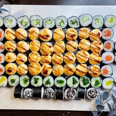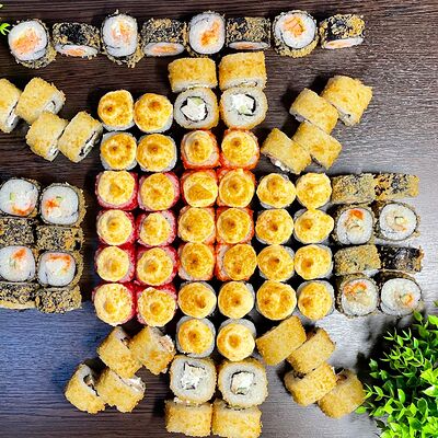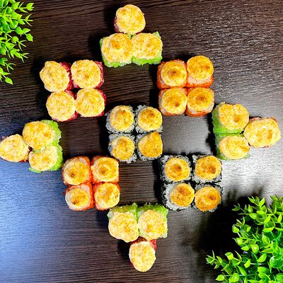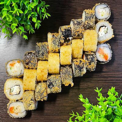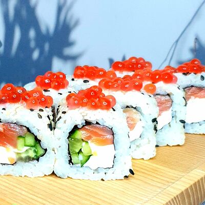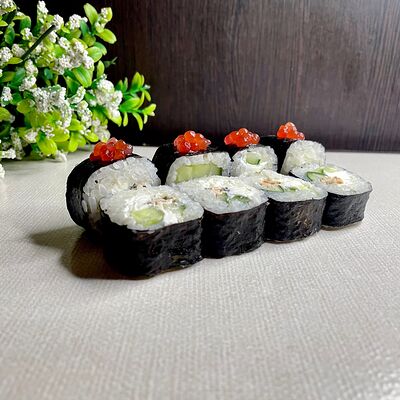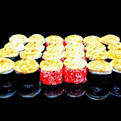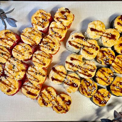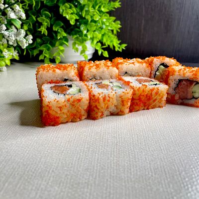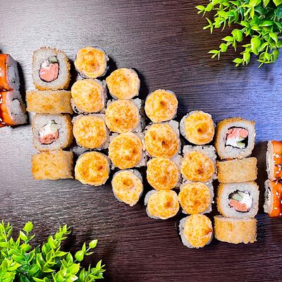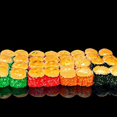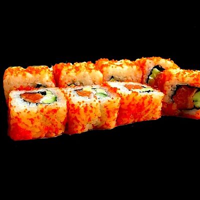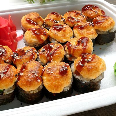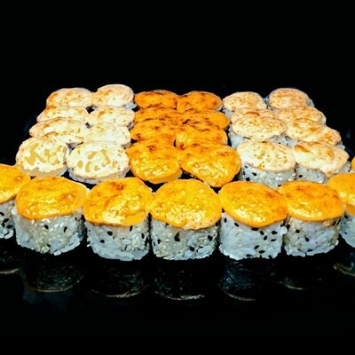 Филадельфия с угрем (угорь, нори, рис, сливочный сыр, огурец), Филадельфия с лососем (лосось, рис, нори, сливочный сыр, огурец), Аляска (лосось, угорь, рис), мини-ролл с лососем