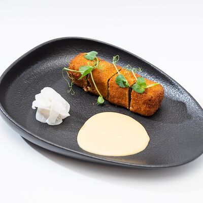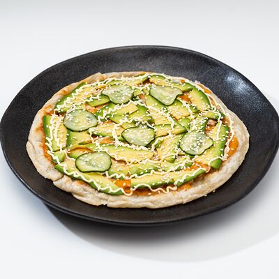 Креветки, соус лаки чили, авокадо, кунжут, огурцы маринованные, зелень (горох), тесто слоеное бездрожжевое. Традиционная индийская лепешка роти с креветками и соусом чили