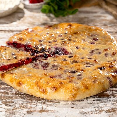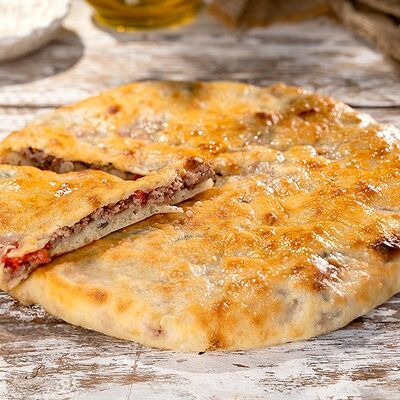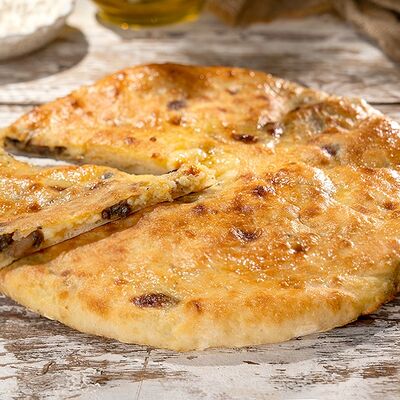 Тесто (пшеничная мука высшего сорта, вода, молоко, маргарин, подсолнечное масло, соль, сахар, дрожжи), сыр брынза, шампиньоны, репчатый лук, специи, пряности, подсолнечное масло, топлёное масло