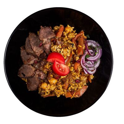 Тесто, соус томатный, сыр моцарелла, свинина, курица, говядина, маринованный огурец, перец сладкий, бекон, базилик, лук репчатый (30 см)