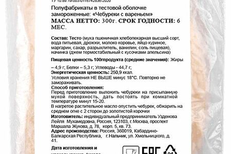Срок годности в днях: 180Состав: тесто (мука пшеничная хлебопекарная высший сорт, вода питьевая, дрожжи, молоко коровье, яйцо куриное, маргарин, сахар, разрыхлитель, ванилин, соль пищевая), начинка (джем термостабильный с кусочками апельсина)Пищевая ценность: Калорийность: 250.9Белки: 5.3Жиры: 4.9Углеводы: 44.7Страна изготовления: РоссияПроизводитель: Delis Frost