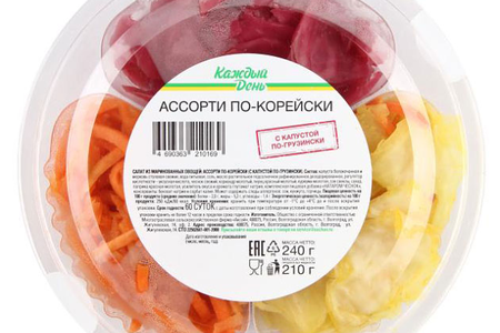 Ассорти по-грузински Каждый день - вкусное блюдо с сочной капустой. Благодаря оригинальному букету специй, отличается насыщенным вкусом и ароматом. Прекрасный вариант для обеда, когда хочется разнообразить рацион чем-то новым и пикантным. Пробуйте новое без лишних усилий вместе с каждый день!Состав: Капуста белокочанная и морковь столовая свежие, вода питьевая, соль, масло растительное подсолнечное рафинированное дезодорированное, регулятор кислотности уксусная кислота, чеснок свежий, кориандр молотый, перец красный молотый, куркума молотая, сок свеклы, сахар, паприка красная молотая, усилитель вкуса и аромата глутамат натрия, комплексная пищевая добавка Натаром чеснок, консерванты бензоат натрия и сорбат калия.