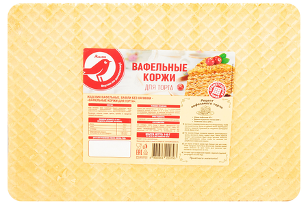 Тонкие и хрустящие вафельные коржи это универсальный полуфабрикат для приготовления различных блюд. К их достоинствам можно отнести удобство и простоту в использовании.Состав: Вода питьевая, мука пшеничная общего назначения, масло подсолнечное рафинированное дезодорированное, соль, разрыхлитель гидрокарбонат натрия, эмульгатор лецитин соевый. Возможно наличие следов орехов, арахиса и продуктов переработки молока.