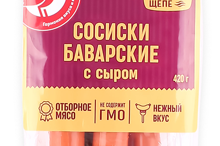 Сосиски Баварские с сыром АШАН Красная птица - Сочные, мясные, аппетитные сосиски. Сливочное масло и настоящий сыр в составе делает их исключительно нежными и сочными. При нагревании сыр плавится, создавая консистенцию нежного сливочного соуса. Приготовлены из охлажденного сырья, с добавлением пряностей и их экстрактов (чеснок, чили). Особенно хороши в обжаренном виде на сковороде или мангале. Отличная начинка для домашнего хот-дога.Состав: Свинина, мясо птицы механической обвалки, говядина, филе куриное, сыр (пастеризованное молоко, закваска молочнокислых микроорганизмов, молокосвертывающий ферментный препарат животного происхождения, соль) масло сливочное, молочный белок, белковый стабилизатор (гуаровая камедь, камедь рожкового дерева) молоко сухое, яйца куриные, крахмал картофельный, нитритная соль (соль, фиксатор окраски нитрит натрия) пряности и экстракты пряностей (чеснок, чили) усилитель вкуса и аромата- глутамат натрия, антиокислитель-аскорбиновая кислота, краситель кармин.
