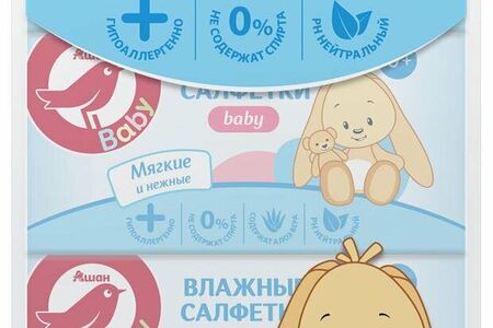Влажные салфетки АШАН Красная птица Baby, 8х8 шт доставка