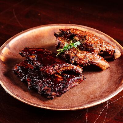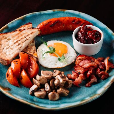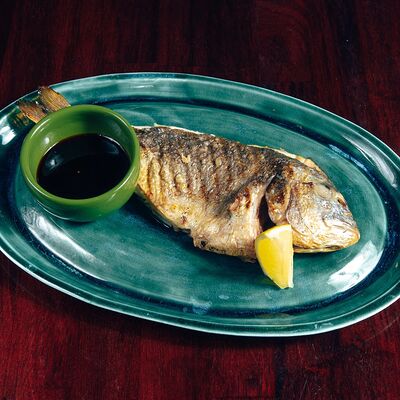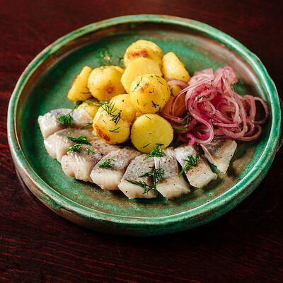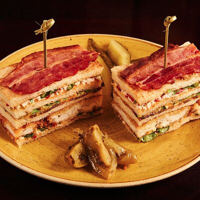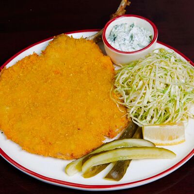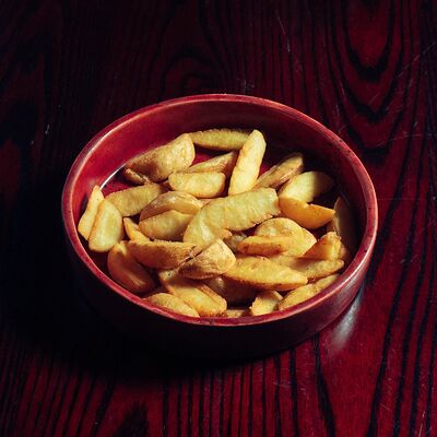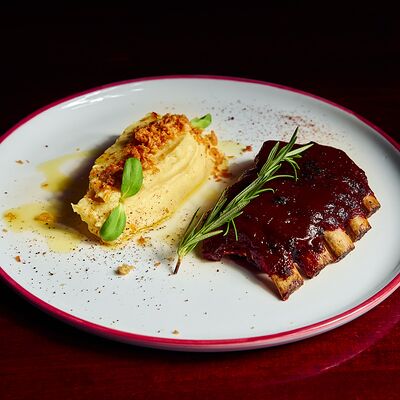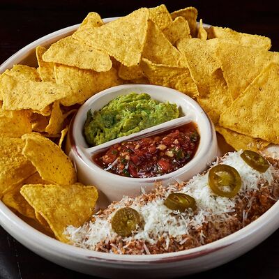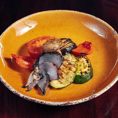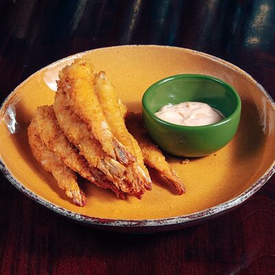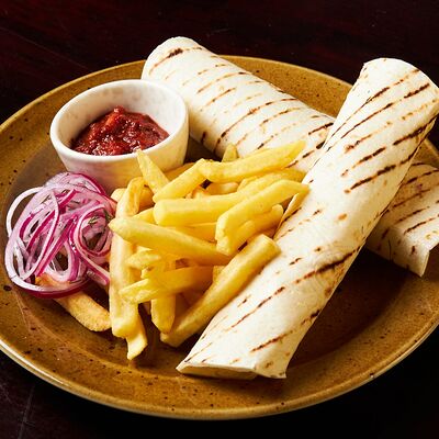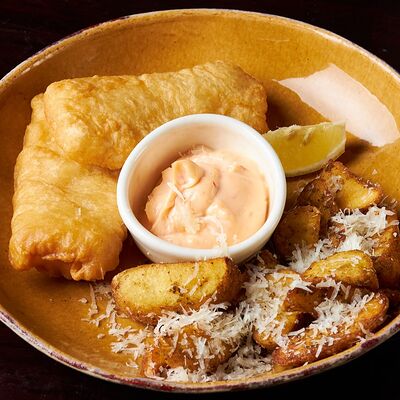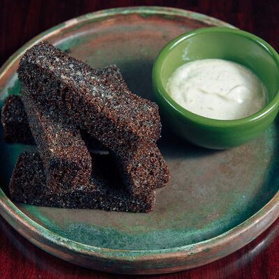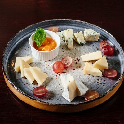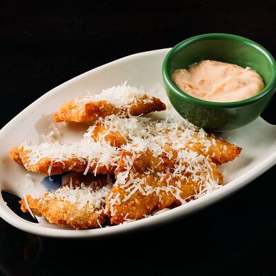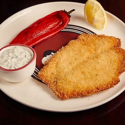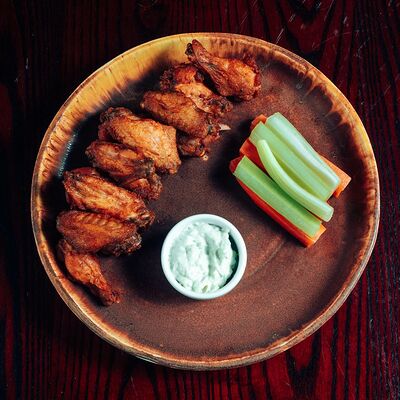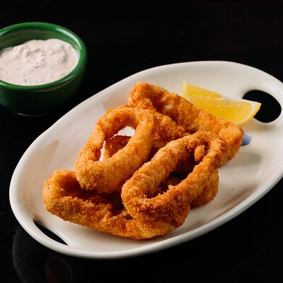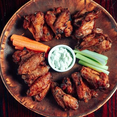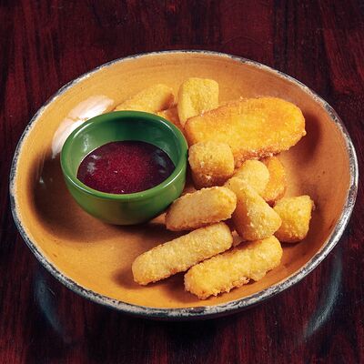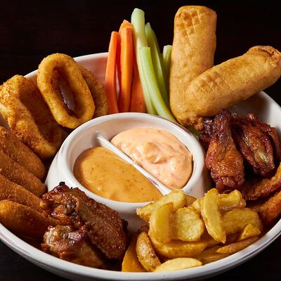 Крылья, куриные стрипсы, сырные палочки, треска в кляре, картофель по-деревенски, кольца кальмара, морковь, сельдерей, соус айоли и медово-горчичный