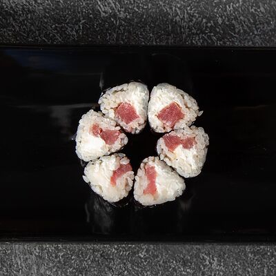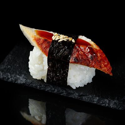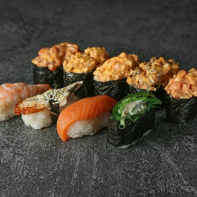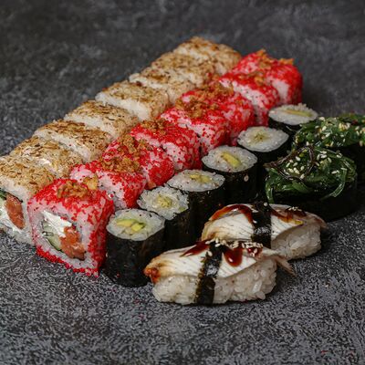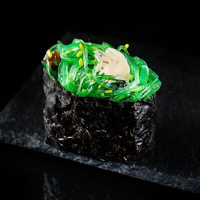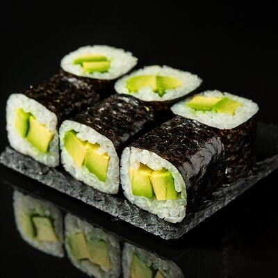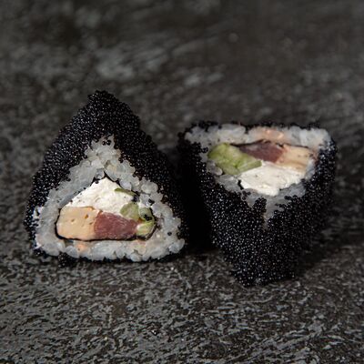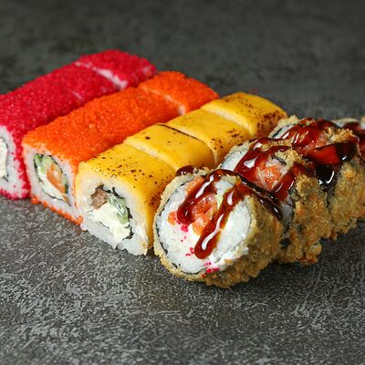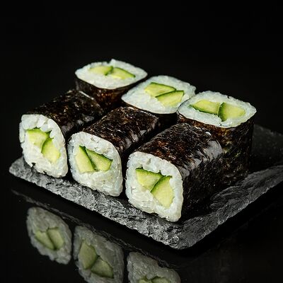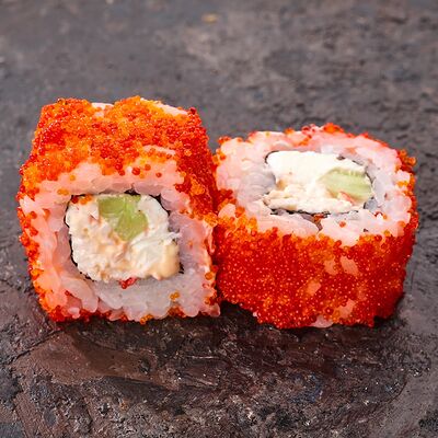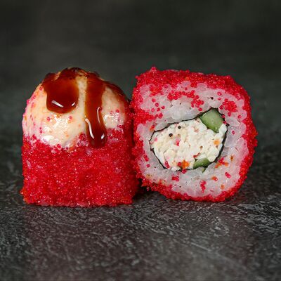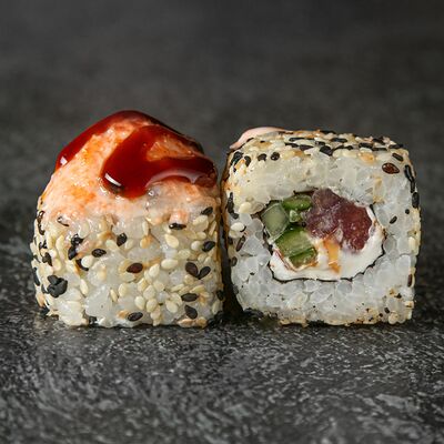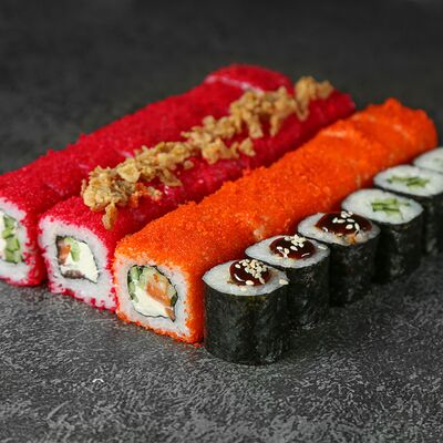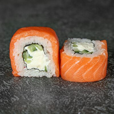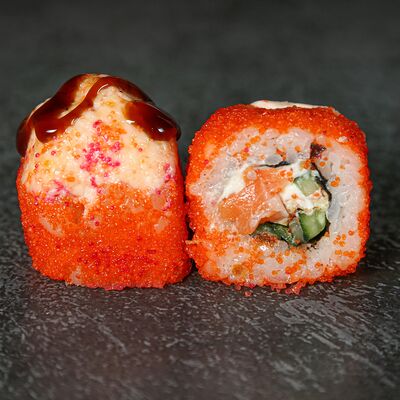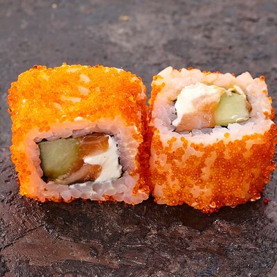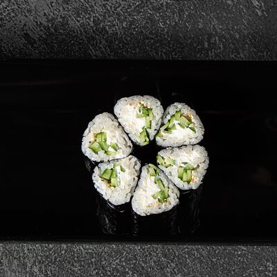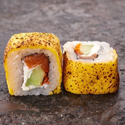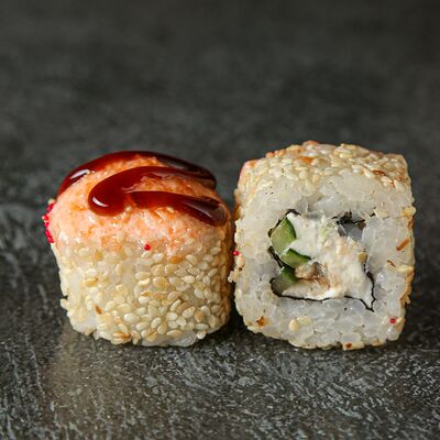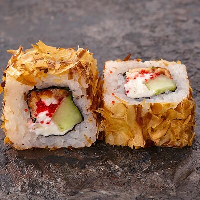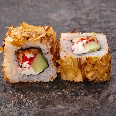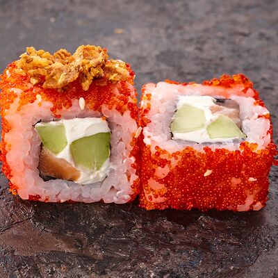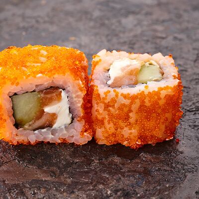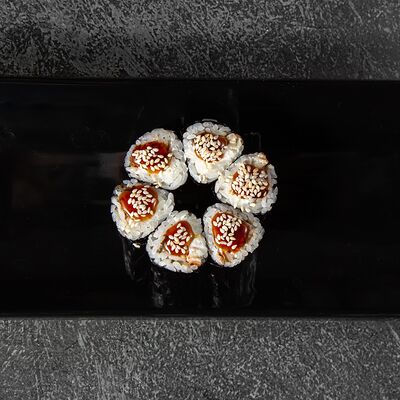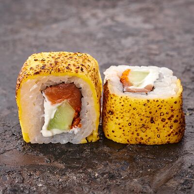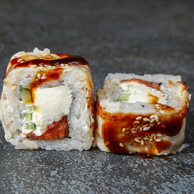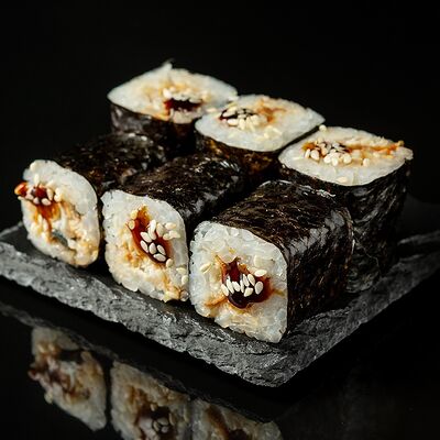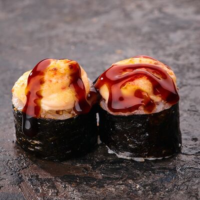 Курица, сыр творожный, омлет, огурец, соус унаги, кунжут, рис, нори, соус пикантный (8 шт.)