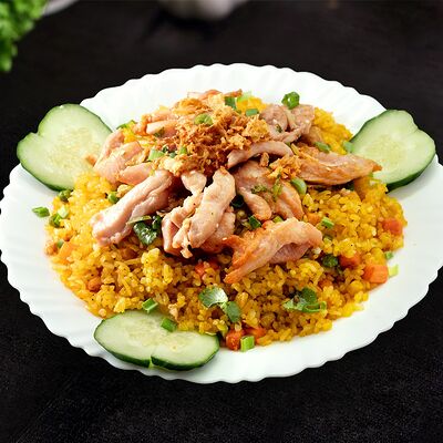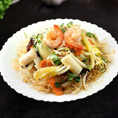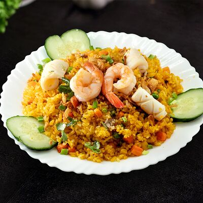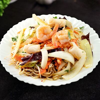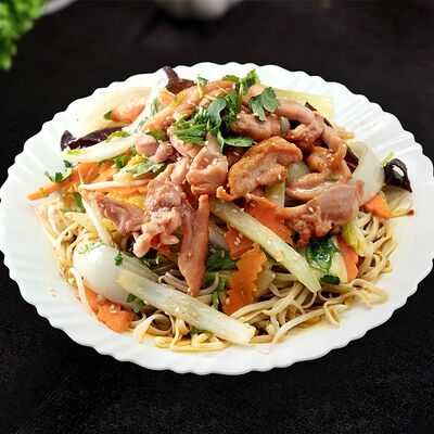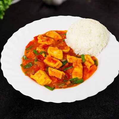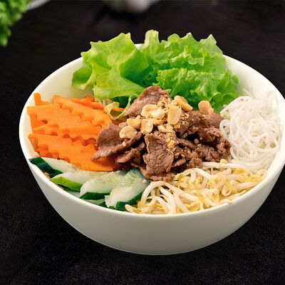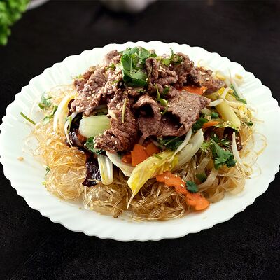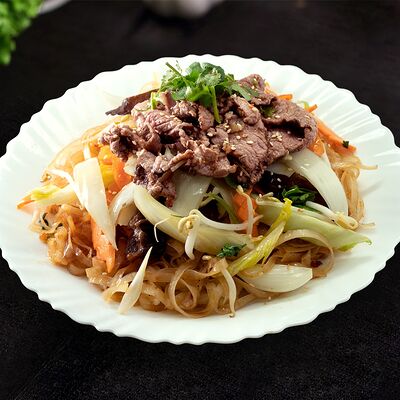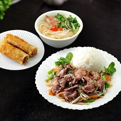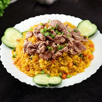 Жареная говядина с овощами, рис и кунжут, нем или салат на выбор