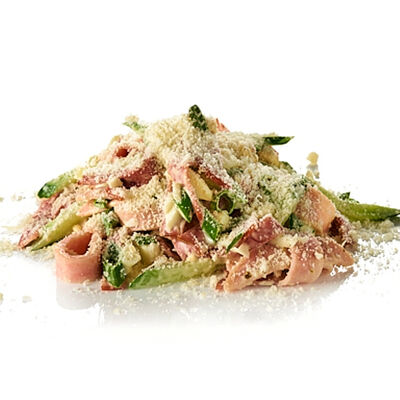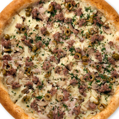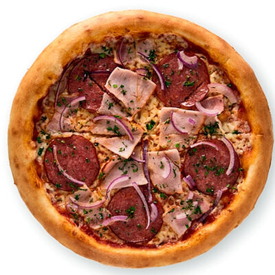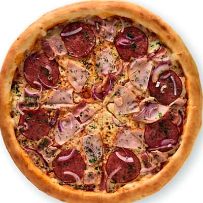 Ветчина, бекон, зелень, сыр моцарелла, соус карбонара (24 см)