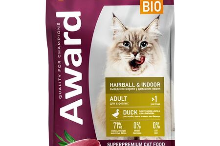 Сухой корм AWARD Hairball & Indoor для взрослых кошек для выведения шерсти с уткой и индейкой доставка
