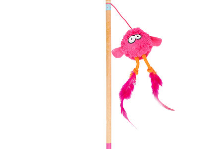 Глазки на симпатичной мордашке вышиты, это безопаснее чем глазки-бусинки, ведь кошка не сможет отгрызть и проглотить что-то лишнее. Игрушка крепится к прочной деревянной палочке длинной резинкой, так что даже самые резкие ваши рывки и дергания не причинят коту неудобств.