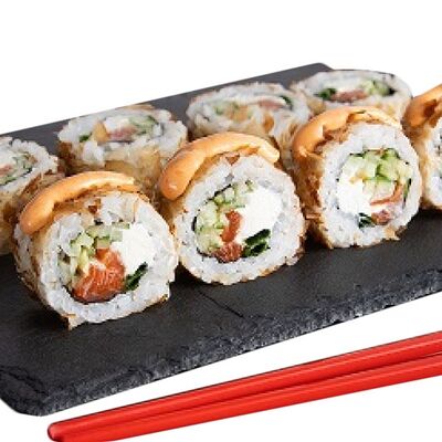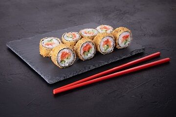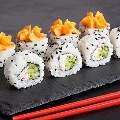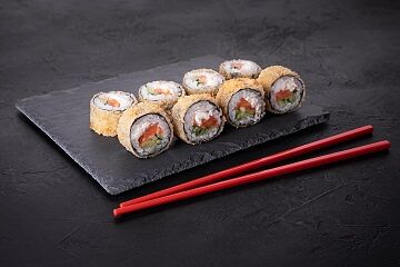 Рис, нори, филе курицы в панировке, огурец, салат айсберг, помидор, соус для запекания, кунжут
