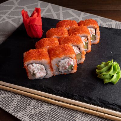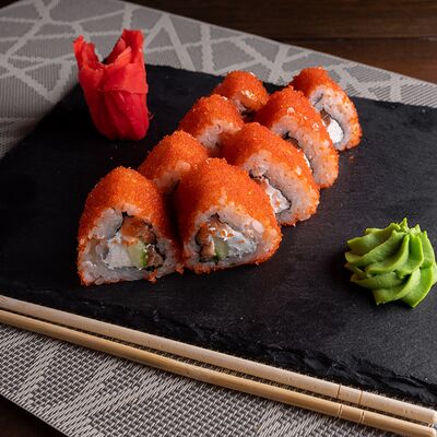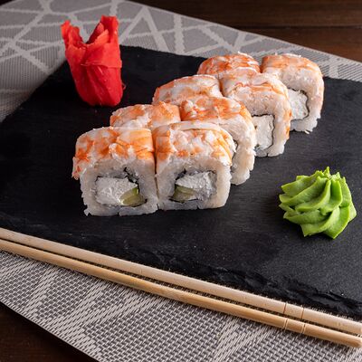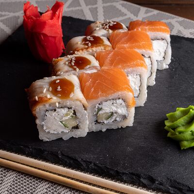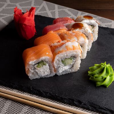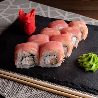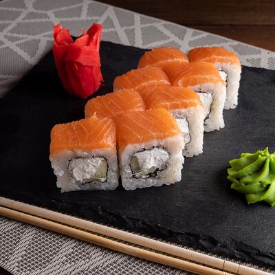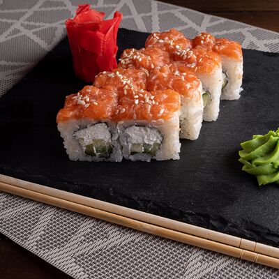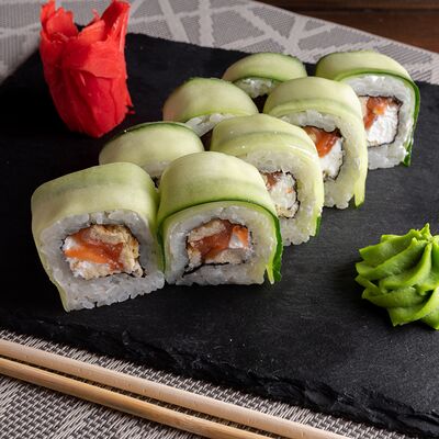 Лосось на выбор (угорь, икра масаго, креветки, снежный краб) огурец свежий сыр сливочный