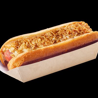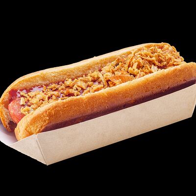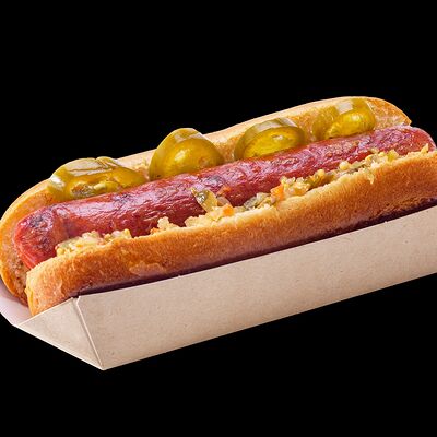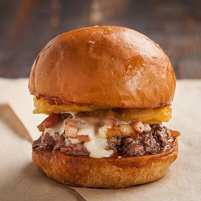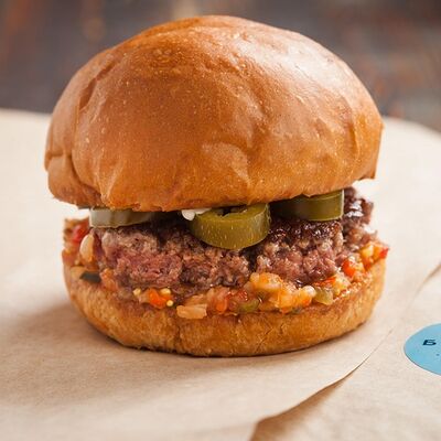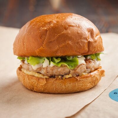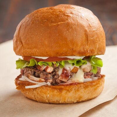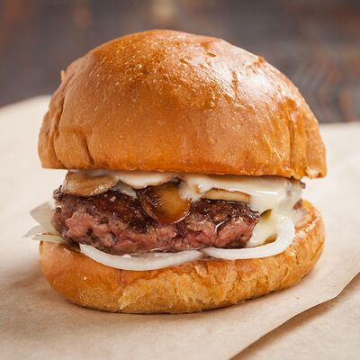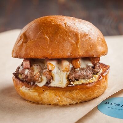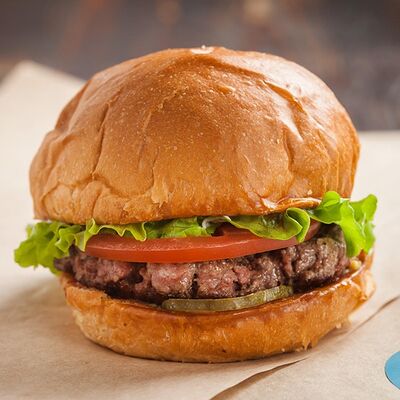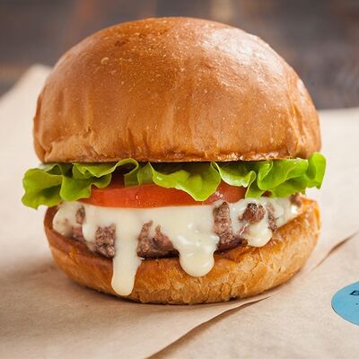 Фирменный соус ранч, лист салата, котлета из мраморной говядины, маринованные огурцы, томат, горчичный соус