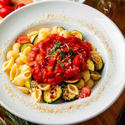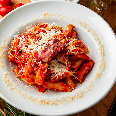 Соус болоньезе (говяжий фарш, лук, морковь, сельдерей), соус бешамель, сыр пармезан, томатный соус
