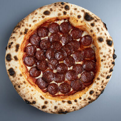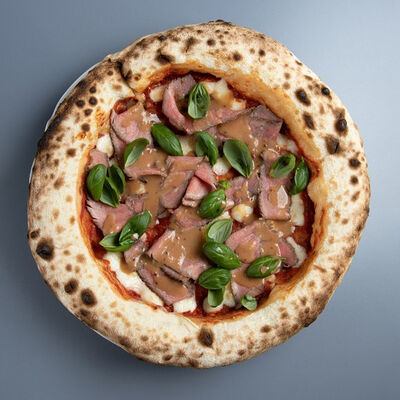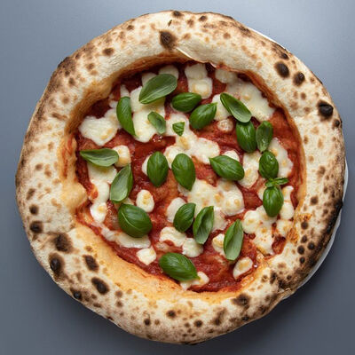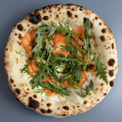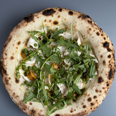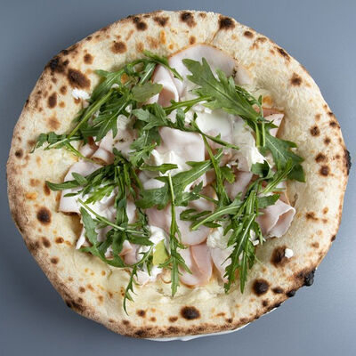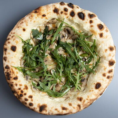 Классическая неаполитанская пицца на ферментированном тесте, белый трюфельный соус, сыр моцарелла, жареные грибы, свежая руккола, оливковое масло (30 см)