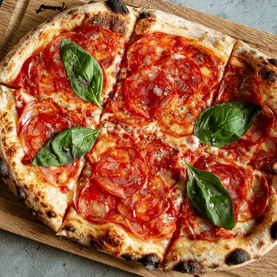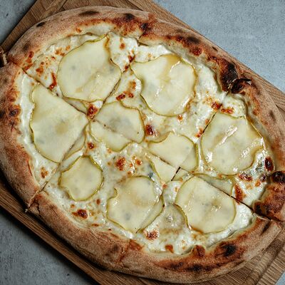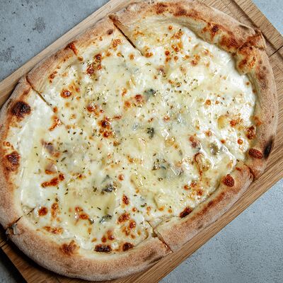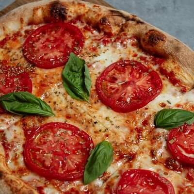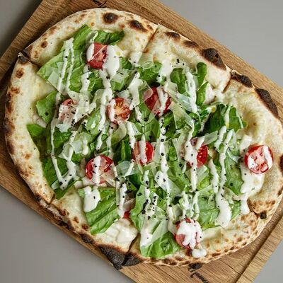 Тонкое тесто с хрустящий корочкой, куриное филе, романо, соус цезарь, сыр пармезан, томаты черри (32 см)