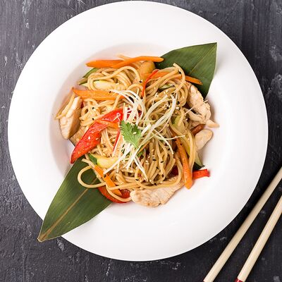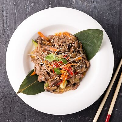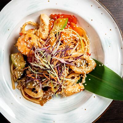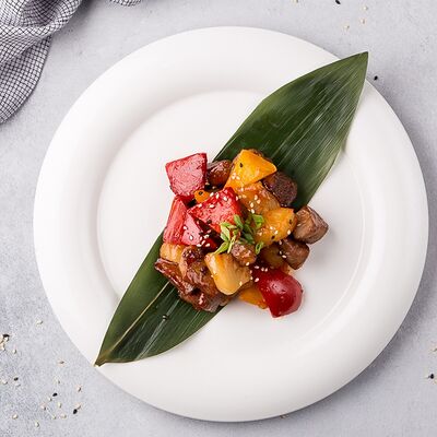 Филе трески, корень имбиря, чеснок, устричный соус, фасоль стручковая, перец болгарский, грибы шиитаке