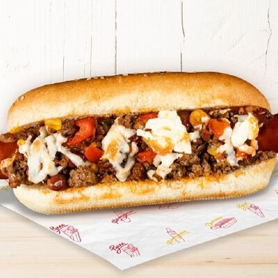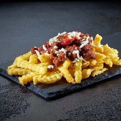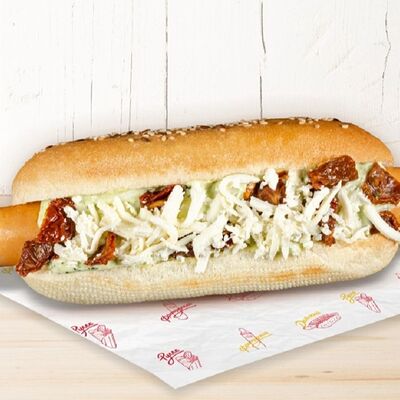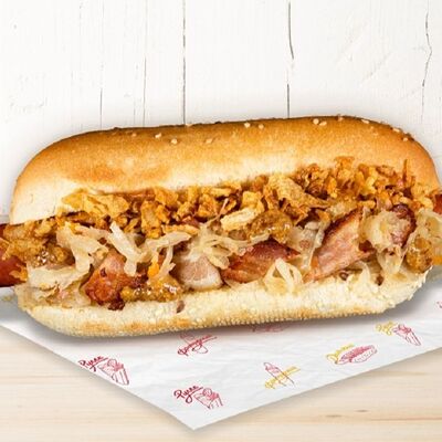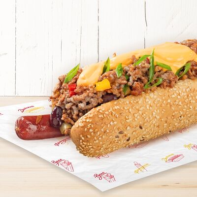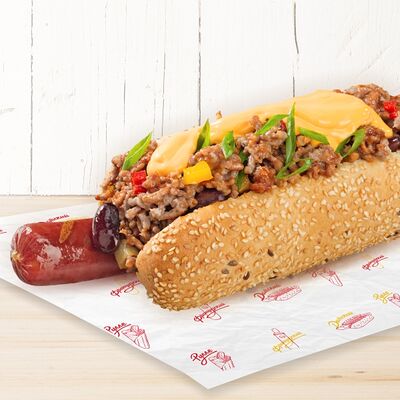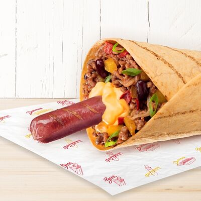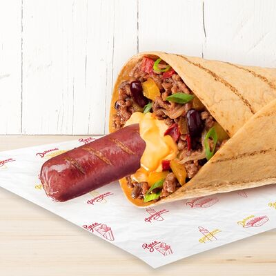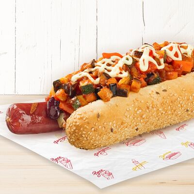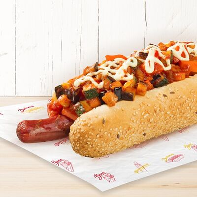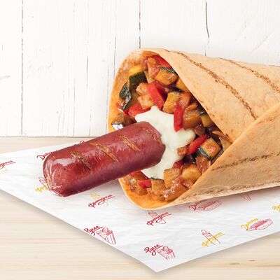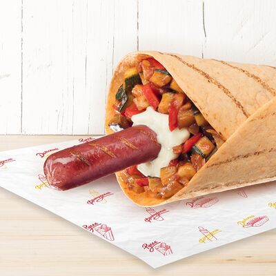 Воздушные шарики картофельного пюре, куриная сосиска с золотистой корочкой в тортилье и ассорти из тушеных кабачков, баклажана и перца под французским дрессингом
