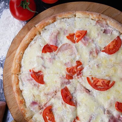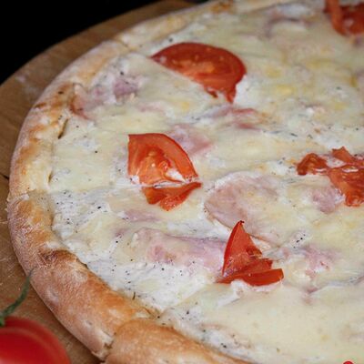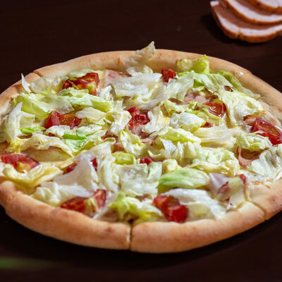 Сыр, копченая курица, помидоры и салатный лист айсберг на чесночно-сметанной основе (31 см)