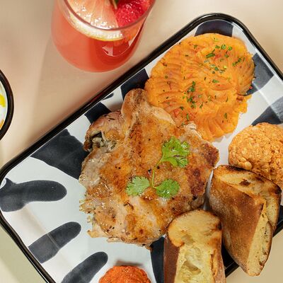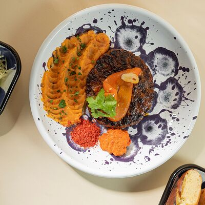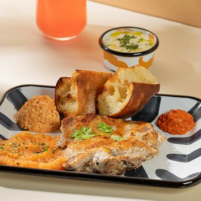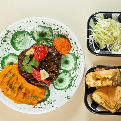 Колбаски из телятины, подаются с запеченным маринованным перцем, македонским картофельным пюре, капустным салатом, маринованым луком и айваром