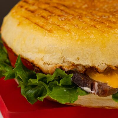 Печеная булочка собственного производства, говядина рубленая, помидор, лист салата, фри, бульон говяжий, вареный курт, сырный соус, кетчуп, перец халапеньо