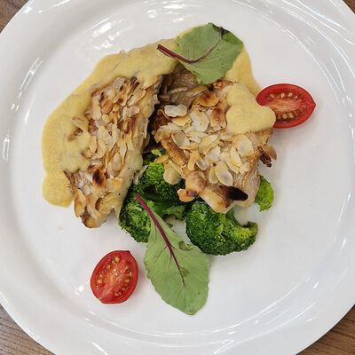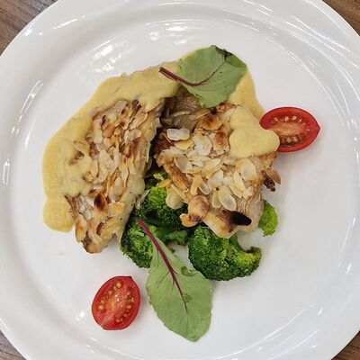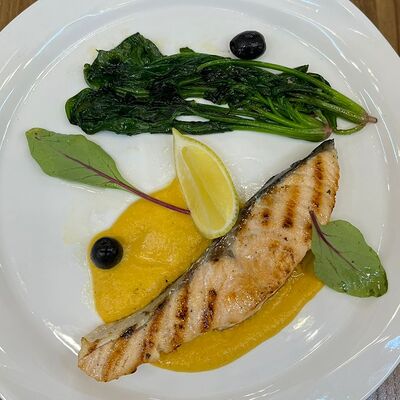 Медальоны из говядины, с тушёными шампиньонами, белыми грибами, нежными сливками, подаётся с миксом из томлённых овощей
