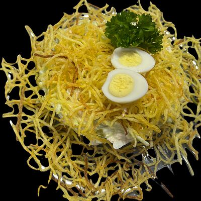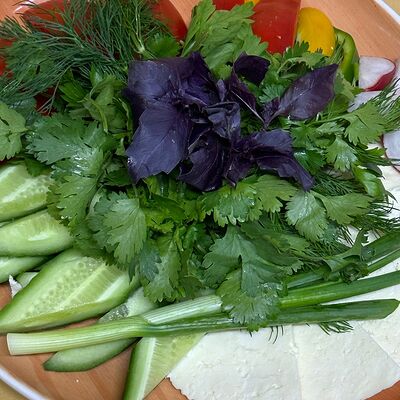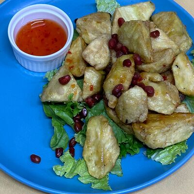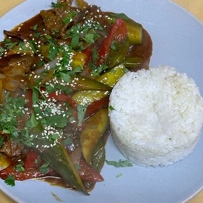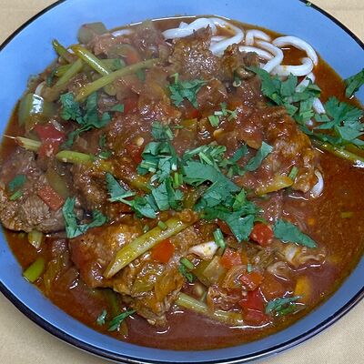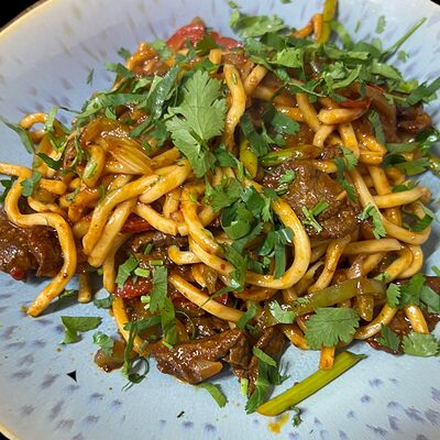 Говядина, лук, красный болгарский перец, сельдерей, пекинская капуста, соевый соус, имбирь, острый соус, чеснок, хаджо, жаренный лагман