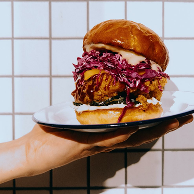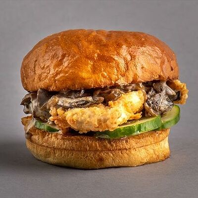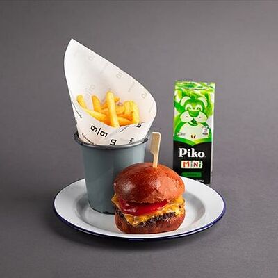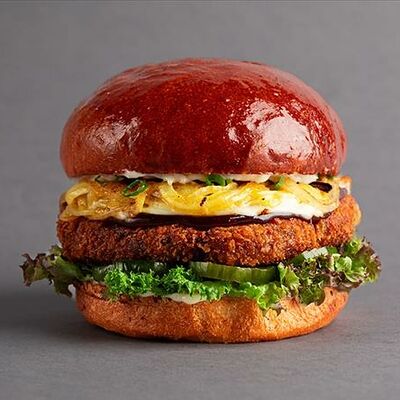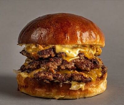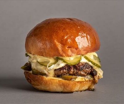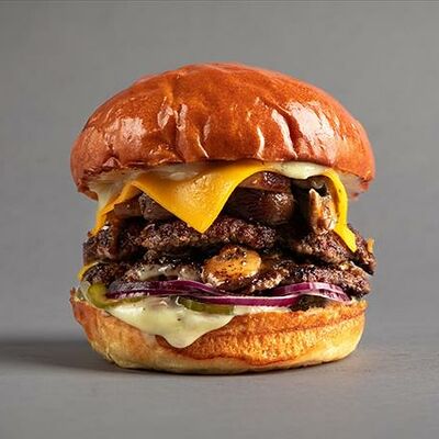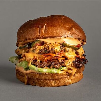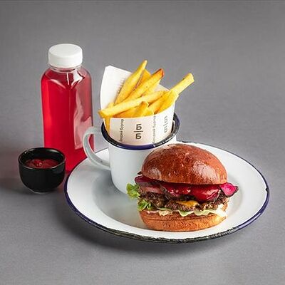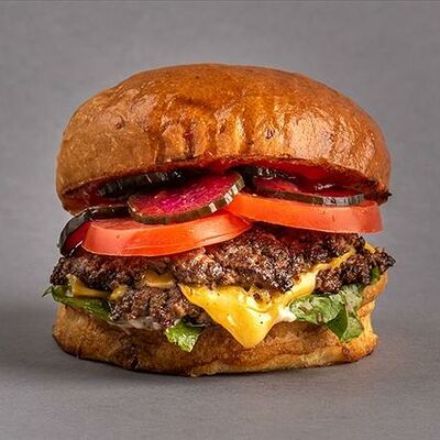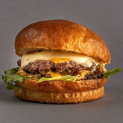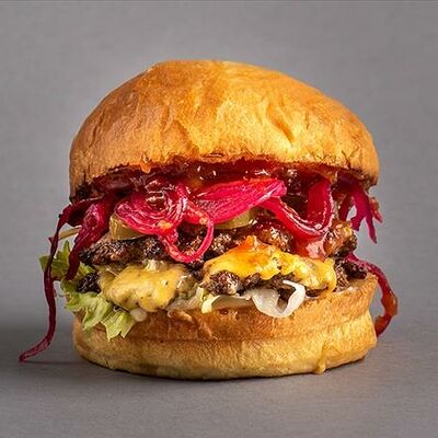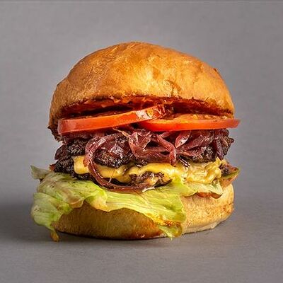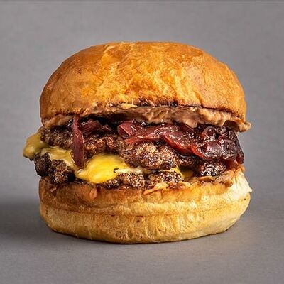 Тостовая булочка, двойная котлета из мраморной говядины, соус 1000 островов, конфитюр из красного лука, сыр Чеддер