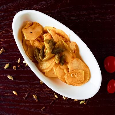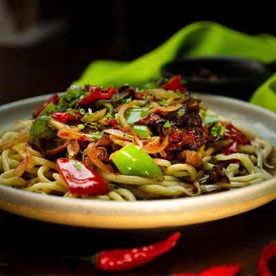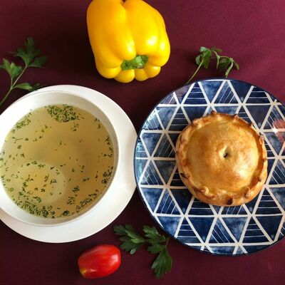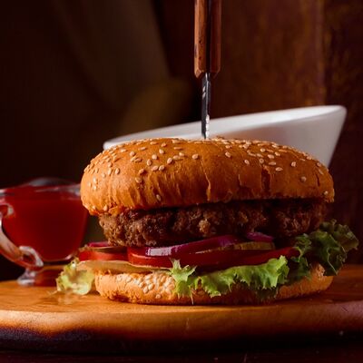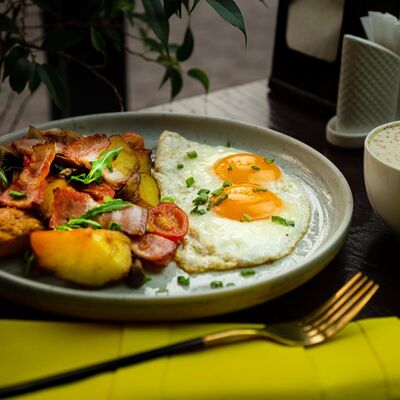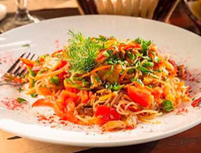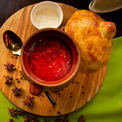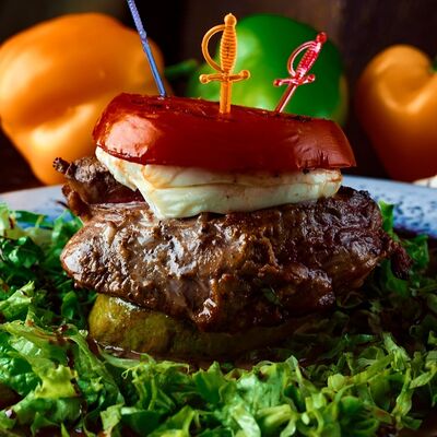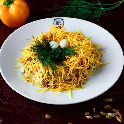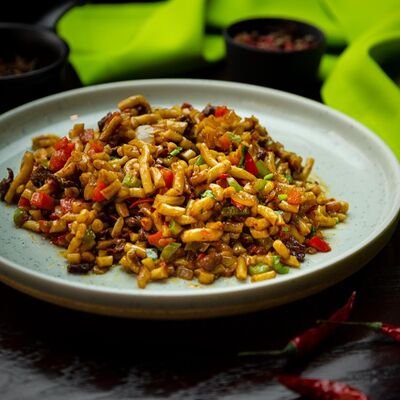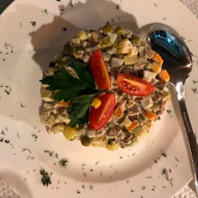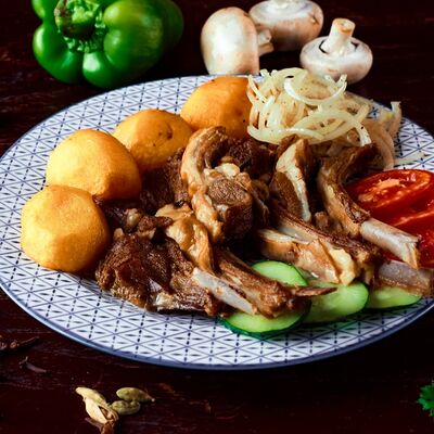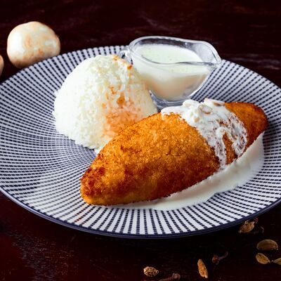 Приготовленный из мелко нарезанных кусочков говядины, залитых горячим сливочным соусом, с луком, подаются с картофельным пюре