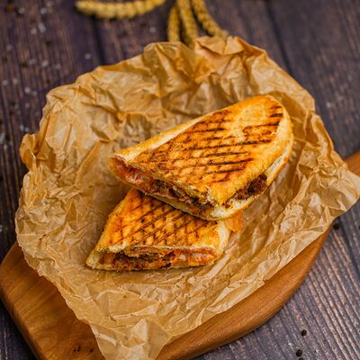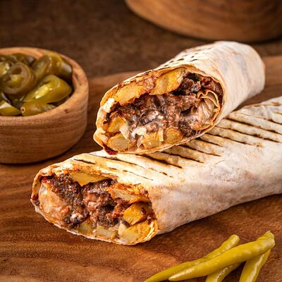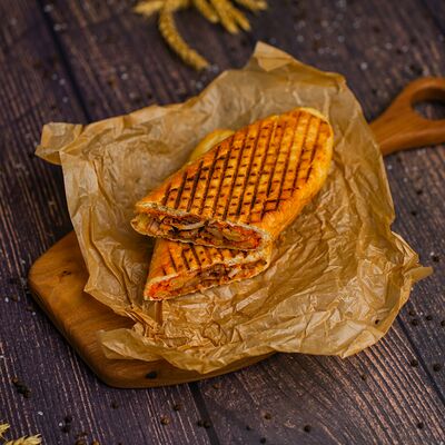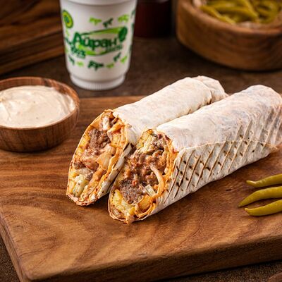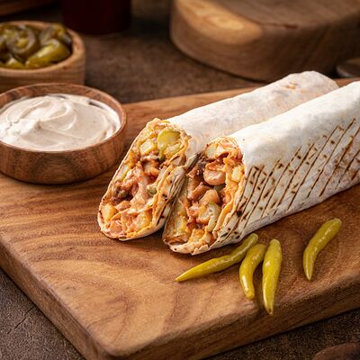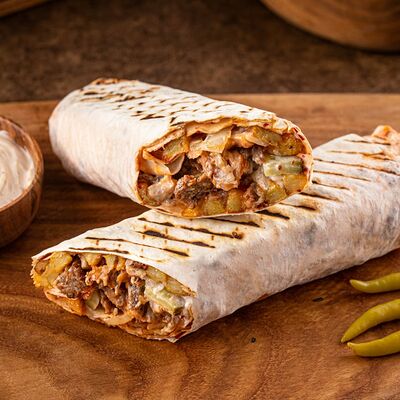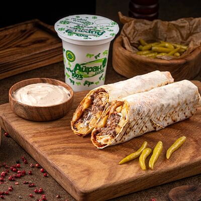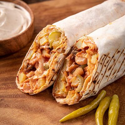 Лаваш, куриное филе, малосольные огурцы, лук, картофель фри, соус