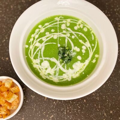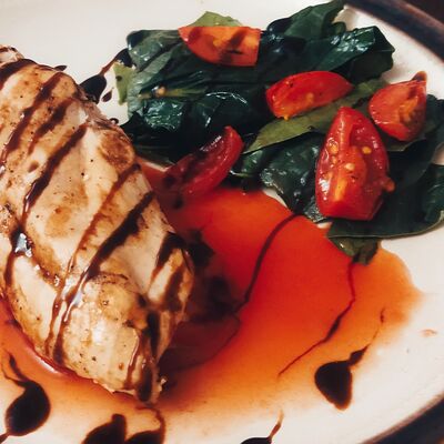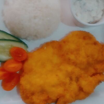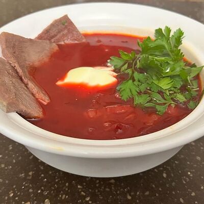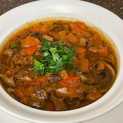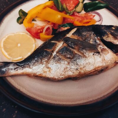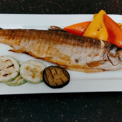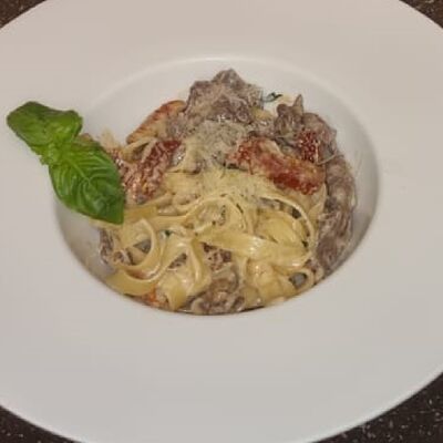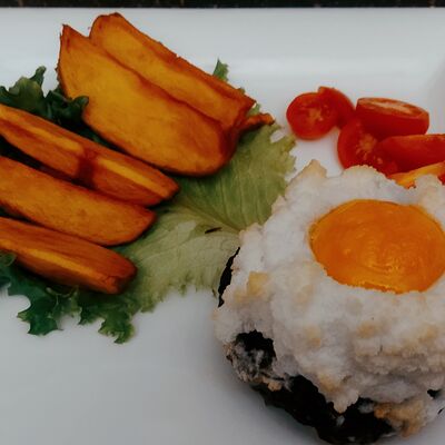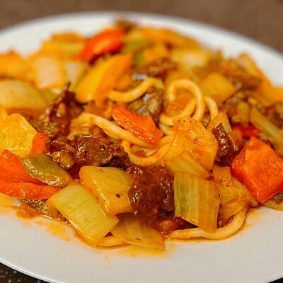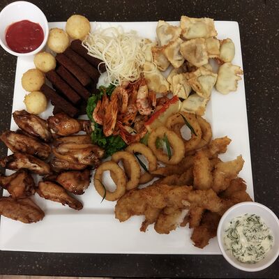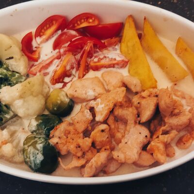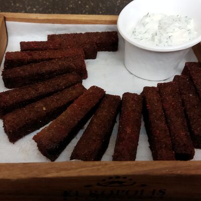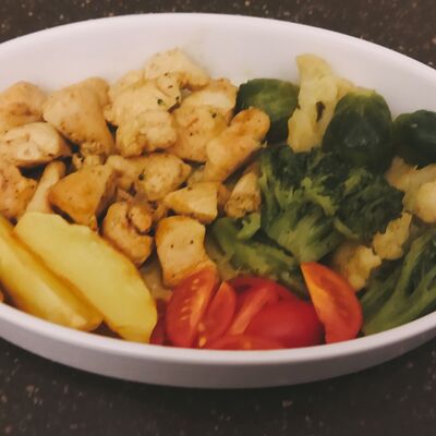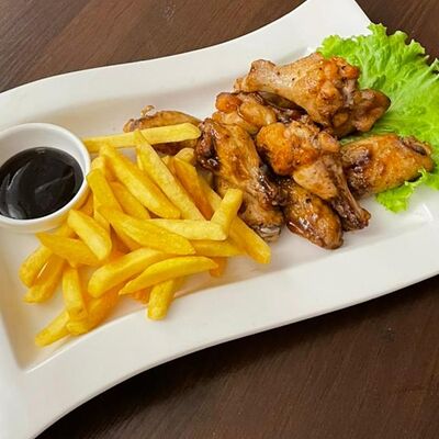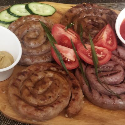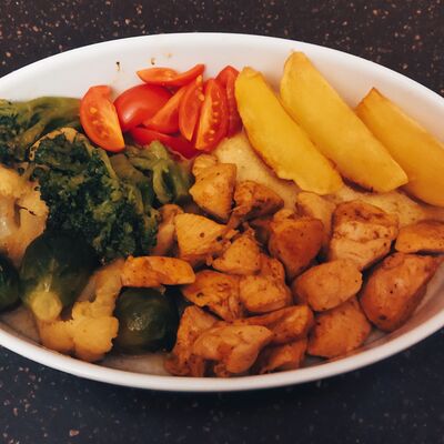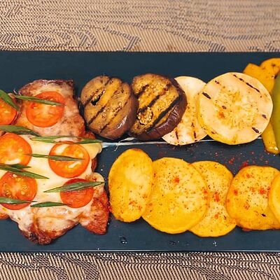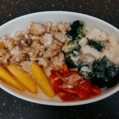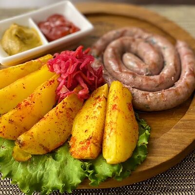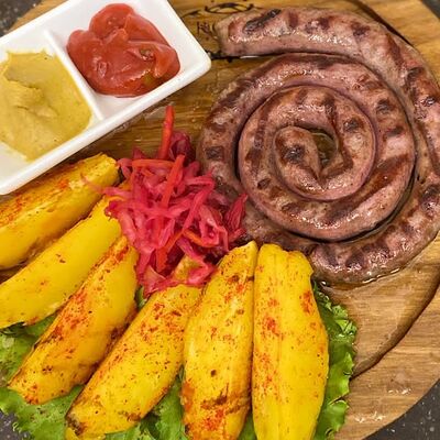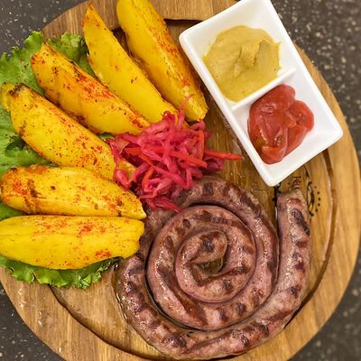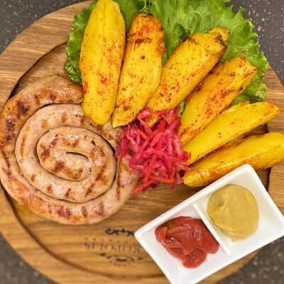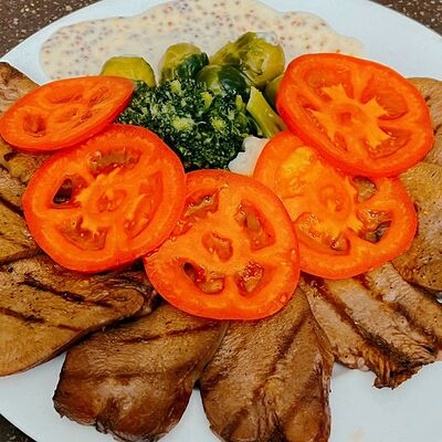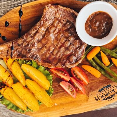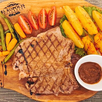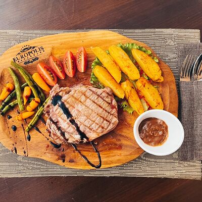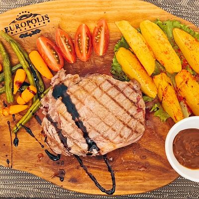 Стейк, картофельные дольки, брюссельская капуста, морковь бэби, свежие овощи, соус кетчуп