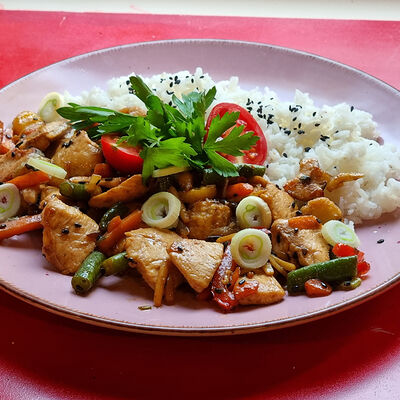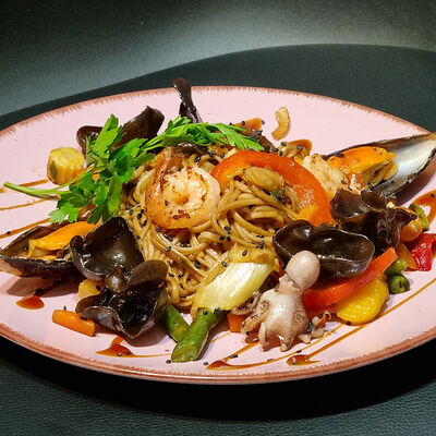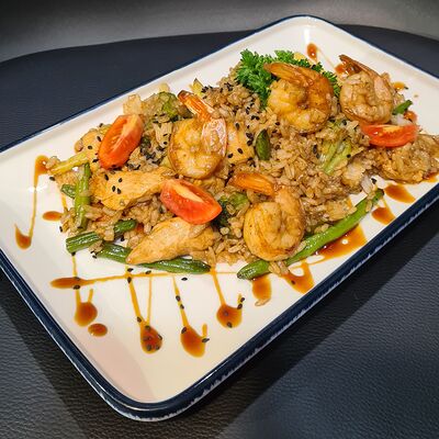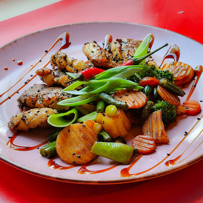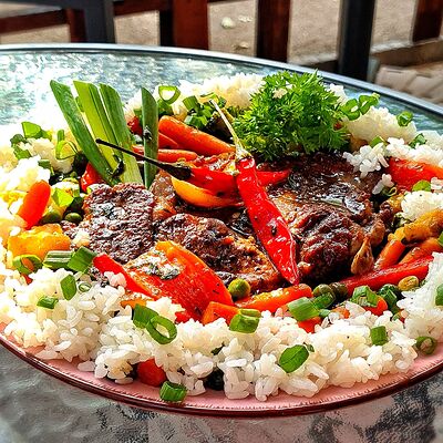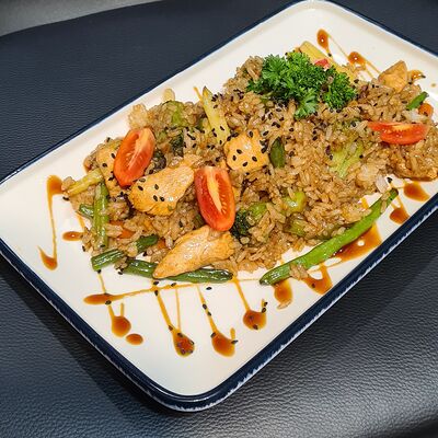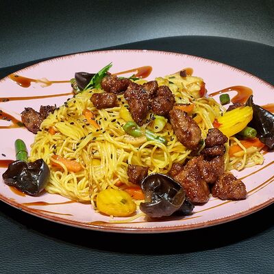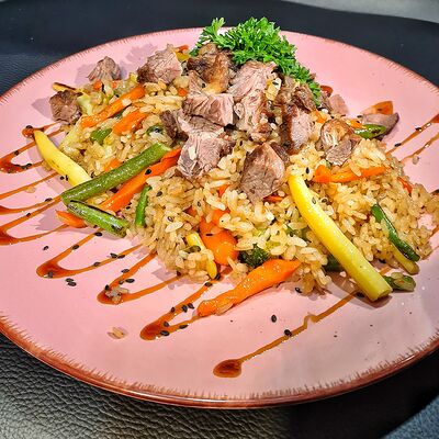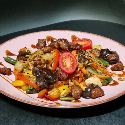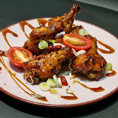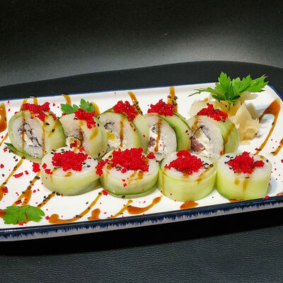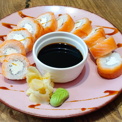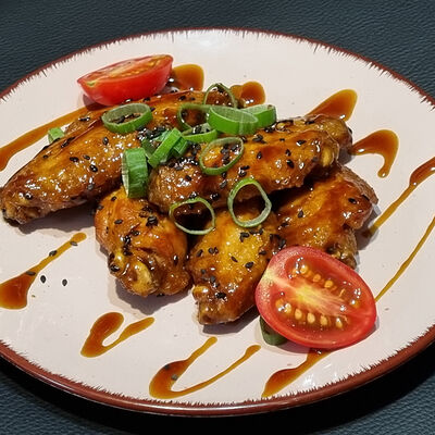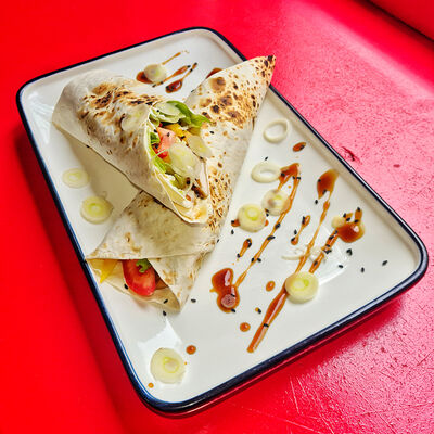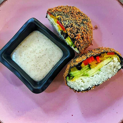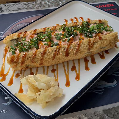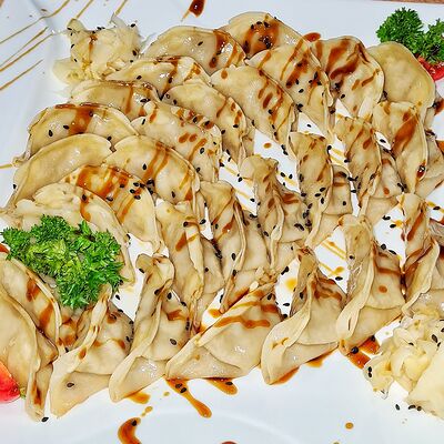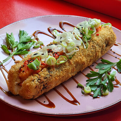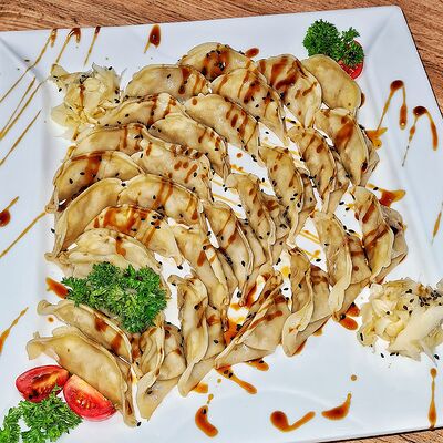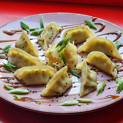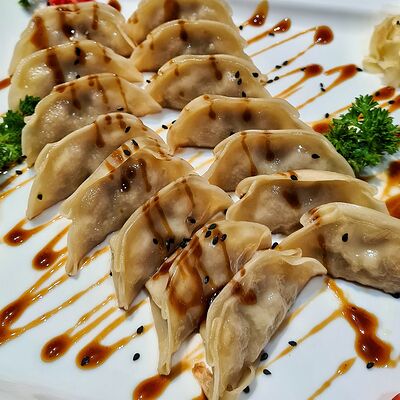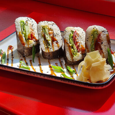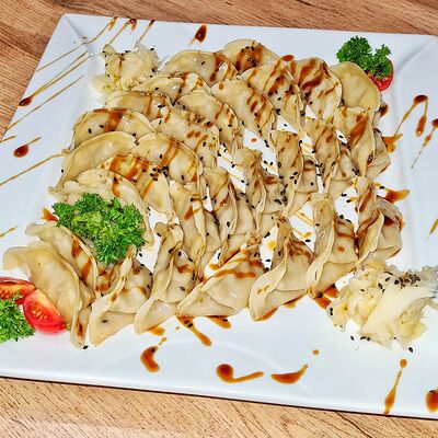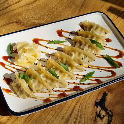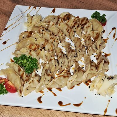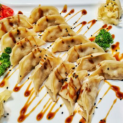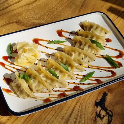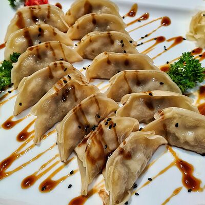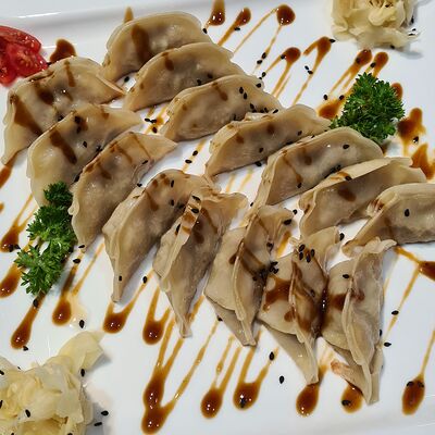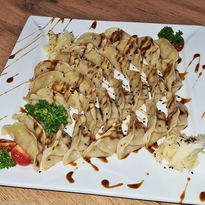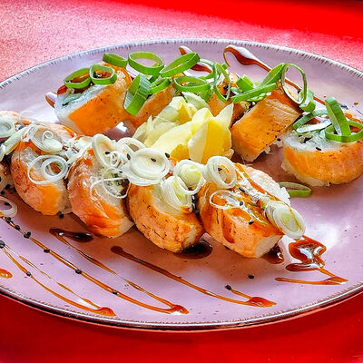 Говяжий фарш, тесто, соус терияки, имбирь маринованный, кунжут (9 шт.)
