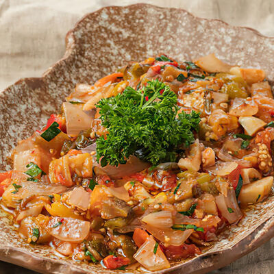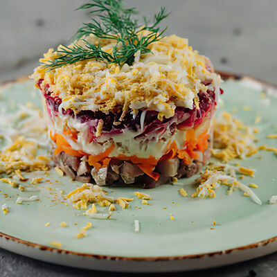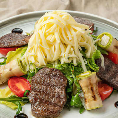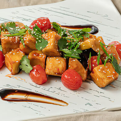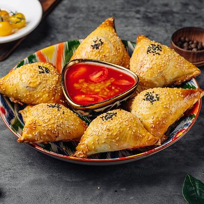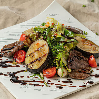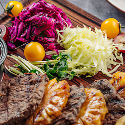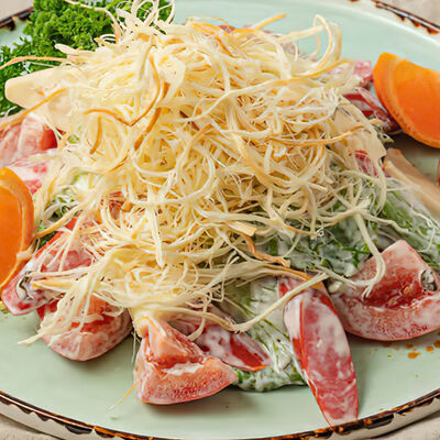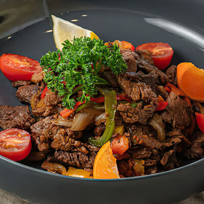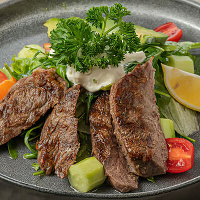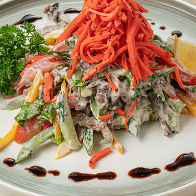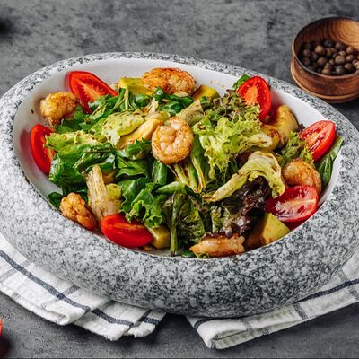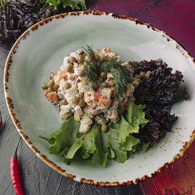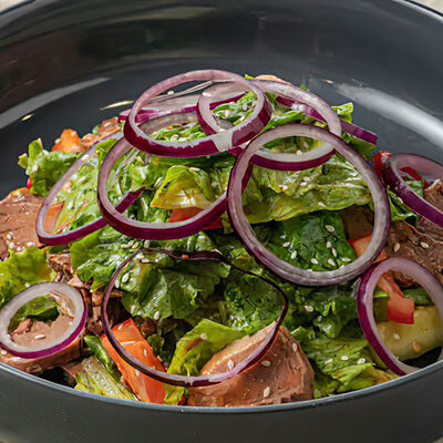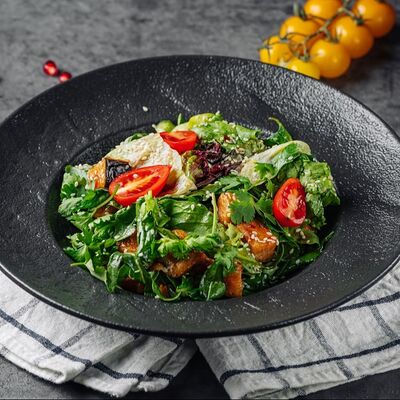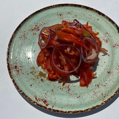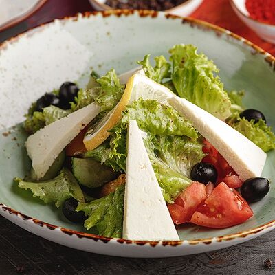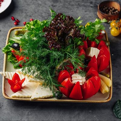 Помидор, огурец, перец светофор, лист салата, брынза, укроп, кинза