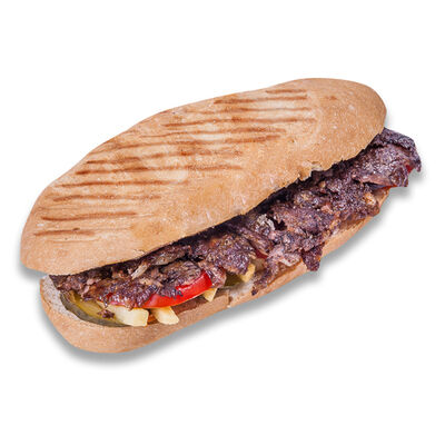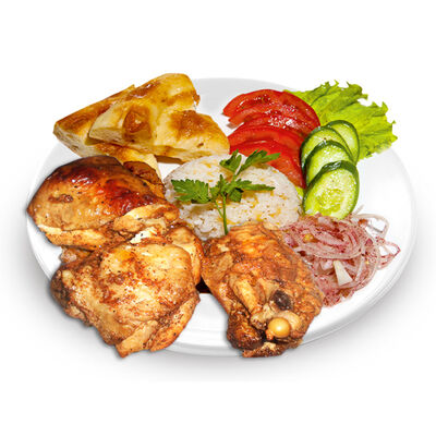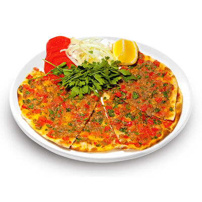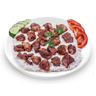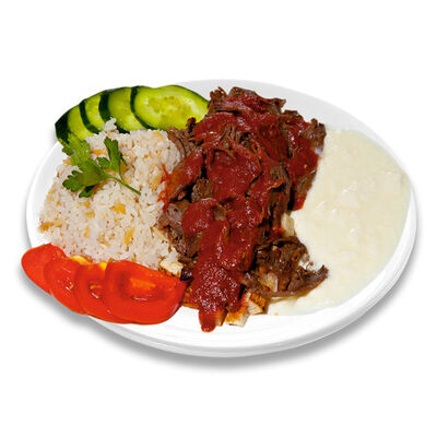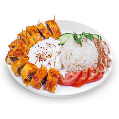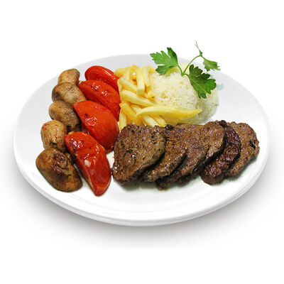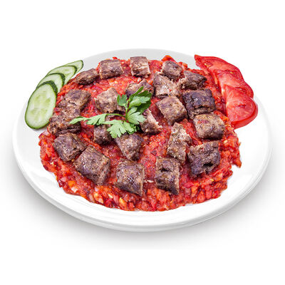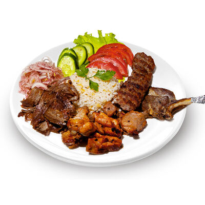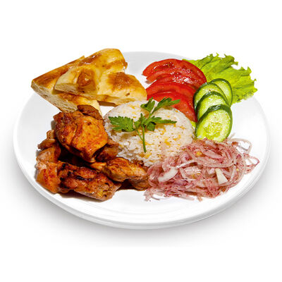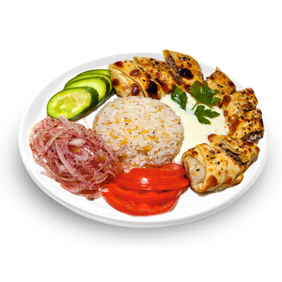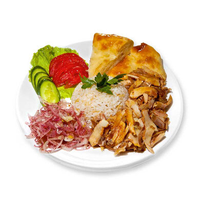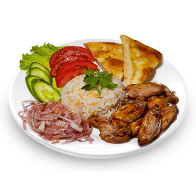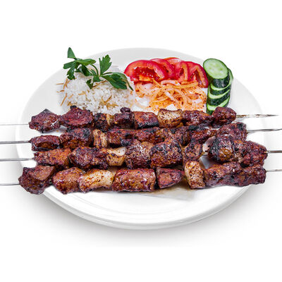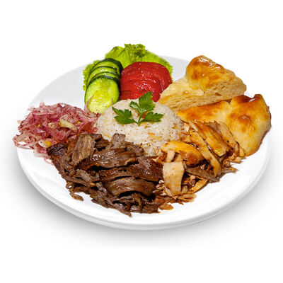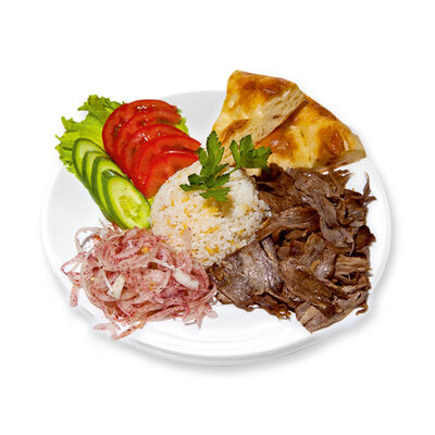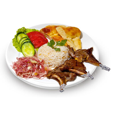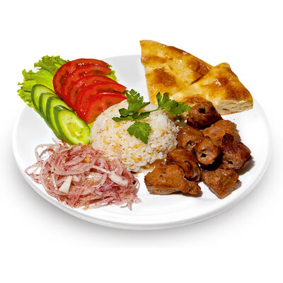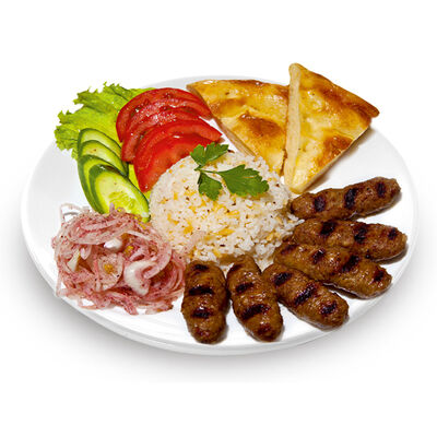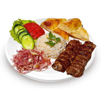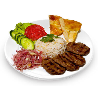 Говяжий фарш, фарш из баранины, лук репчатый, помидор, огурец, рис, 2 кусочка лепешки