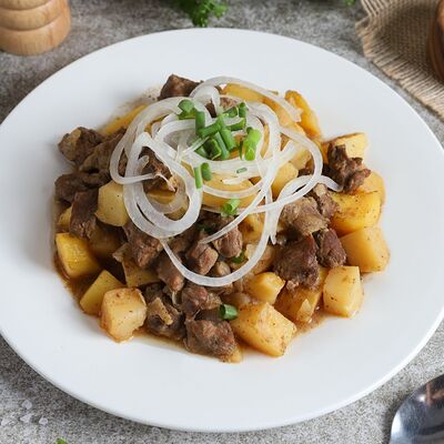 Тушеная конина (жая), картофель, лук