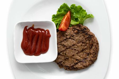 Говядина, лук пассерованный, кетчуп, соль