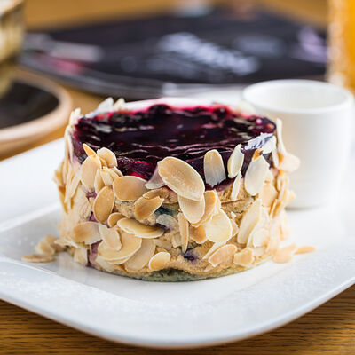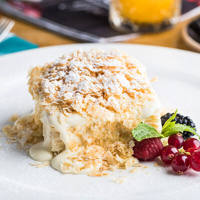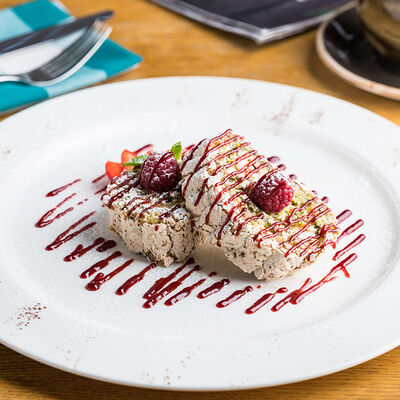 Безе, фисташки, миндаль, сливочный крем, малиновый соус, ягоды, мята
