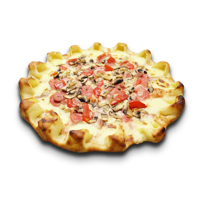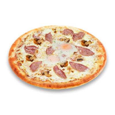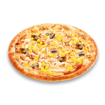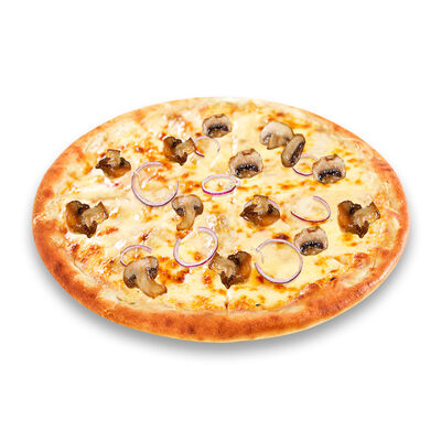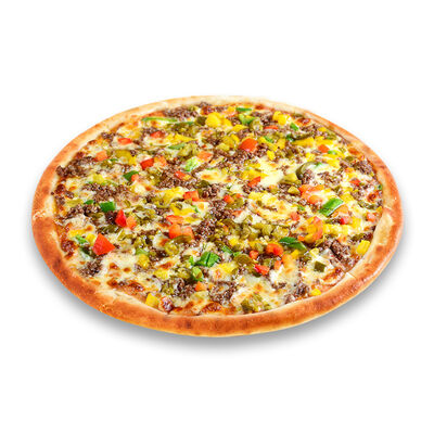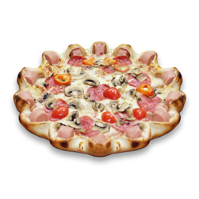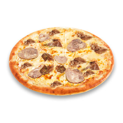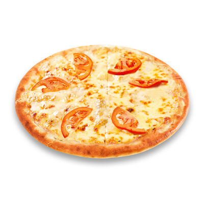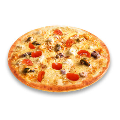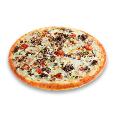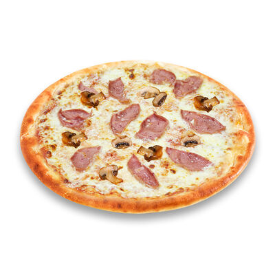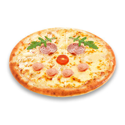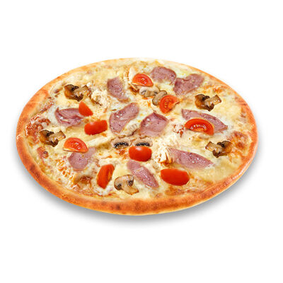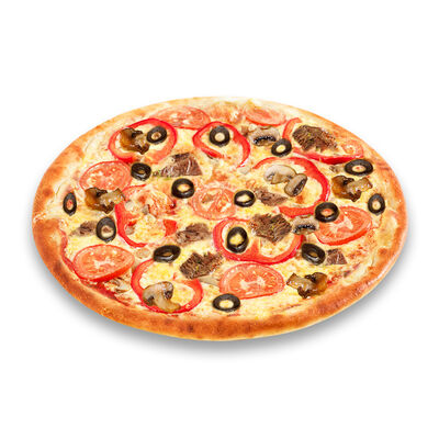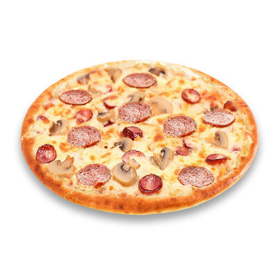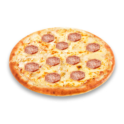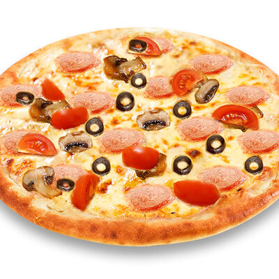 Моцарелла, голландский сыр, черри, шампиньоны, маслины, сосиски говяжьи, соус томатный. Размер на выбор